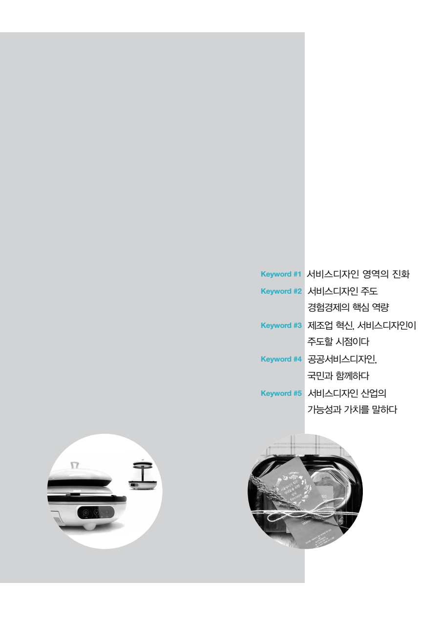Keyword #1 서비스디자인 영역의 진화 Keyword #2 서비스디자인 주도 경험경제의 핵심 역량 Keyword #3 제조업 혁신, 서비스디자인이 주도할 시점이다 Keyword #4 공공서비스디자인, 국민과 함께하다 Keyword #5 서비스디자인 산업의 가능성과 가치를 말하다