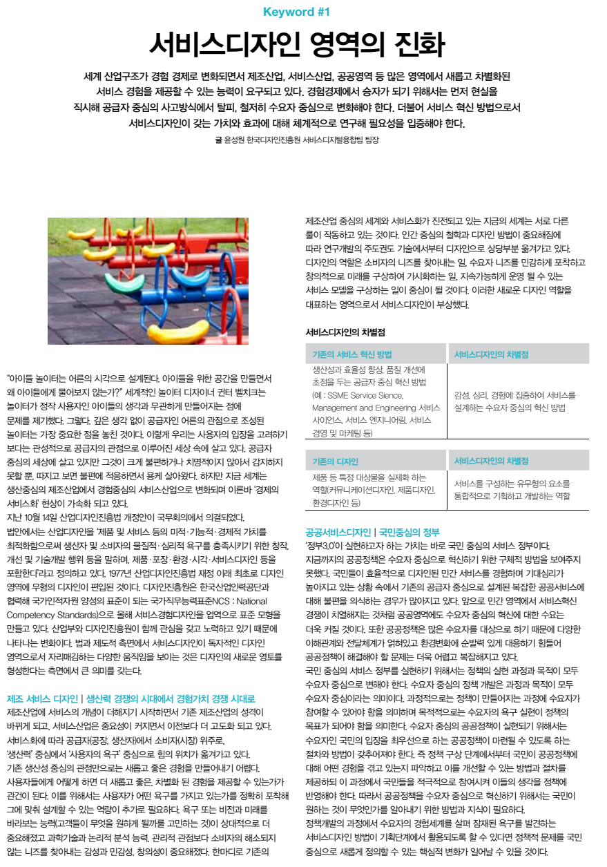 세계 산업구조가 경험 경제로 변화되면서 제조산업, 서비스산업, 공공영역 등 많은 영역에서 새롭고 차별화된 서비스 경험을 제공할 수 있는 능력이 요구되고 있다. 경험경제에서 승자가 되기 위해서는 먼저 현실을 직시해 공급자 중심의 사고방식에서 탈피, 철저히 수요자 중심으로 변화해야 한다. 더불어 서비스 혁신 방법으로서 서비스디자인이 갖는 가치와 효과에 대해 체계적으로 연구해 필요성을 입증해야 한다. 글 윤성원 한국디자인진흥원 서비스디지털융합팀 팀장 12 S p e c i a l T h e m e “아이들 놀이터는 어른의 시각으로 설계된다. 아이들을 위한 공간을 만들면서 왜 아이들에게 물어보지 않는가?” 세계적인 놀이터 디자이너 귄터 벨치크는 놀이터가 정작 사용자인 아이들의 생각과 무관하게 만들어지는 점에 문제를 제기했다. 그렇다. 깊은 생각 없이 공급자인 어른의 관점으로 조성된 놀이터는 가장 중요한 점을 놓친 것이다. 이렇게 우리는 사용자의 입장을 고려하기 보다는 관성적으로 공급자의 관점으로 이루어진 세상 속에 살고 있다. 공급자 중심의 세상에 살고 있지만 그것이 크게 불편하거나 치명적이지 않아서 감지하지 못할 뿐, 따지고 보면 불편에 적응하면서 용케 살아왔다. 하지만 지금 세계는 생산중심의 제조산업에서 경험중심의 서비스산업으로 변화되며 이른바 ‘경제의 서비스화’ 현상이 가속화 되고 있다. 지난 10월 14일 산업디자인진흥법 개정안이 국무회의에서 의결되었다. 법안에서는 산업디자인을 ‘제품 및 서비스 등의 미적·기능적·경제적 가치를 최적화함으로써 생산자 및 소비자의 물질적·심리적 욕구를 충족시키기 위한 창작, 개선 및 기술개발 행위 등을 말하며, 제품·포장·환경·시각·서비스디자인 등을 포함한다’라고 정의하고 있다. 1977년 산업디자인진흥법 재정 이래 최초로 디자인 영역에 무형의 디자인이 편입된 것이다. 디자인진흥원은 한국산업인력공단과 협력해 국가인적자원 양성의 표준이 되는 국가직무능력표준NCS : National Competency Standards)으로 올해 서비스경험디자인을 업역으로 표준 모형을 만들고 있다. 산업부와 디자인진흥원이 함께 관심을 갖고 노력하고 있기 때문에 나타나는 변화이다. 법과 제도적 측면에서 서비스디자인이 독자적인 디자인 영역으로서 자리매김하는 다양한 움직임을 보이는 것은 디자인의 새로운 영토를 형성한다는 측면에서 큰 의미를 갖는다. 제조 서비스 디자인 | 생산력 경쟁의 시대에서 경험가치 경쟁 시대로 제조산업에 서비스의 개념이 더해지기 시작하면서 기존 제조산업의 성격이 바뀌게 되고, 서비스산업은 중요성이 커지면서 이전보다 더 고도화 되고 있다. 서비스화에 따라 공급자(공장, 생산자)에서 소비자(시장) 위주로, ‘생산력’ 중심에서 ‘사용자의 욕구’ 중심으로 힘의 위치가 옮겨가고 있다. 기존 생산성 중심의 관점만으로는 새롭고 좋은 경험을 만들어내기 어렵다. 사용자들에게 어떻게 하면 더 새롭고 좋은, 차별화 된 경험을 제공할 수 있는가가 관건이 된다. 이를 위해서는 사용자가 어떤 욕구를 가지고 있는가를 정확히 포착해 그에 맞춰 설계할 수 있는 역량이 추가로 필요하다. 욕구 또는 비전과 미래를 바라보는 능력(고객들이 무엇을 원하게 될까를 고민하는 것)이 상대적으로 더 중요해졌고 과학기술과 논리적 분석 능력, 관리적 관점보다 소비자의 해소되지 않는 니즈를 찾아내는 감성과 민감성, 창의성이 중요해졌다. 한마디로 기존의 제조산업 중심의 세계와 서비스화가 진전되고 있는 지금의 세계는 서로 다른 룰이 작동하고 있는 것이다. 인간 중심의 철학과 디자인 방법이 중요해짐에 따라 연구개발의 주도권도 기술에서부터 디자인으로 상당부분 옮겨가고 있다. 디자인의 역할은 소비자의 니즈를 찾아내는 일, 수요자 니즈를 민감하게 포착하고 창의적으로 미래를 구상하여 가시화하는 일, 지속가능하게 운영 될 수 있는 서비스 모델을 구상하는 일이 중심이 될 것이다. 이러한 새로운 디자인 역할을 대표하는 영역으로서 서비스디자인이 부상했다. 서비스디자인의 차별점 기존의 서비스 혁신 방법 서비스디자인의 차별점 생산성과 효율성 향상, 품질 개선에 초점을 두는 공급자 중심 혁신 방법 (예 : SSME Service Sience, Management and Engineering 서비스 사이언스, 서비스 엔지니어링, 서비스 경영 및 마케팅 등) 감성, 심리, 경험에 집중하여 서비스를 설계하는 수요자 중심의 혁신 방법 기존의 디자인 서비스디자인의 차별점 제품 등 특정 대상물을 실제화 하는 역할(커뮤니케이션디자인, 제품디자인, 환경디자인 등) 서비스를 구성하는 유무형의 요소를 통합적으로 기획하고 개발하는 역할 공공서비스디자인 | 국민중심의 정부 ‘정부3.0’이 실현하고자 하는 가치는 바로 국민 중심의 서비스 정부이다. 지금까지의 공공정책은 수요자 중심으로 혁신하기 위한 구체적 방법을 보여주지 못했다. 국민들이 효율적으로 디자인된 민간 서비스를 경험하며 기대심리가 높아지고 있는 상황 속에서 기존의 공급자 중심으로 설계된 복잡한 공공서비스에 대해 불편을 의식하는 경우가 많아지고 있다. 앞으로 