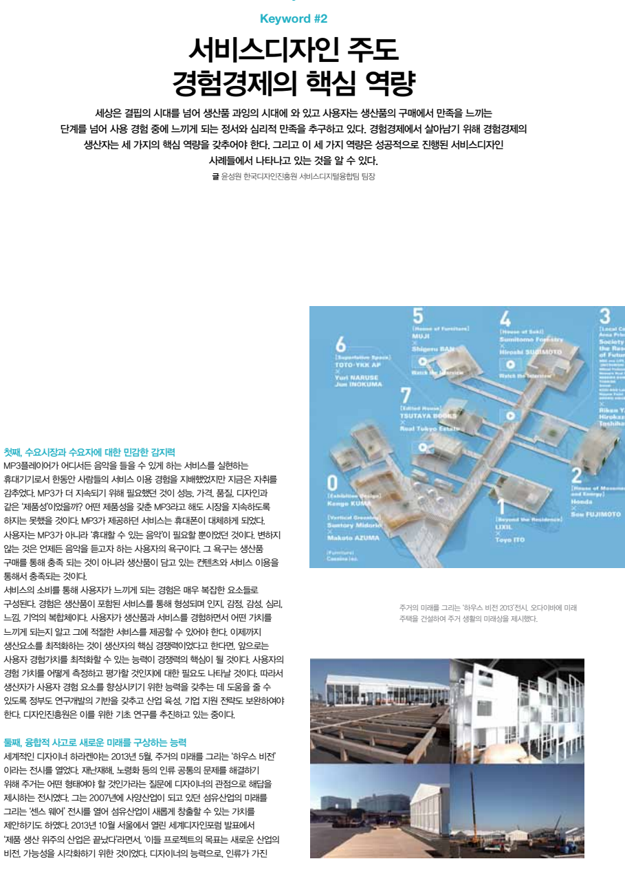 세상은 결핍의 시대를 넘어 생산품 과잉의 시대에 와 있고 사용자는 생산품의 구매에서 만족을 느끼는 단계를 넘어 사용 경험 중에 느끼게 되는 정서와 심리적 만족을 추구하고 있다. 경험경제에서 살아남기 위해 경험경제의 생산자는 세 가지의 핵심 역량을 갖추어야 한다. 그리고 이 세 가지 역량은 성공적으로 진행된 서비스디자인 첫째, 수요시장과 수요자에 대한 민감한 감지력 MP3플레이어가 어디서든 음악을 들을 수 있게 하는 서비스를 실현하는 휴대기기로서 한동안 사람들의 서비스 이용 경험을 지배했었지만 지금은 자취를 감추었다. MP3가 더 지속되기 위해 필요했던 것이 성능, 가격, 품질, 디자인과 같은 ‘제품성’이었을까? 어떤 제품성을 갖춘 MP3라고 해도 시장을 지속하도록 하지는 못했을 것이다. MP3가 제공하던 서비스는 휴대폰이 대체하게 되었다. 사용자는 MP3가 아니라 ‘휴대할 수 있는 음악’이 필요할 뿐이었던 것이다. 변하지 않는 것은 언제든 음악을 듣고자 하는 사용자의 욕구이다. 그 욕구는 생산품 구매를 통해 충족 되는 것이 아니라 생산품이 담고 있는 컨텐츠와 서비스 이용을 통해서 충족되는 것이다. 서비스의 소비를 통해 사용자가 느끼게 되는 경험은 매우 복잡한 요소들로 구성된다. 경험은 생산품이 포함된 서비스를 통해 형성되며 인지, 감정, 감성, 심리, 느낌, 기억의 복합체이다. 사용자가 생산품과 서비스를 경험하면서 어떤 가치를 느끼게 되는지 알고 그에 적절한 서비스를 제공할 수 있어야 한다. 이제까지 생산요소를 최적화하는 것이 생산자의 핵심 경쟁력이었다고 한다면, 앞으로는 사용자 경험가치를 최적화할 수 있는 능력이 경쟁력의 핵심이 될 것이다. 사용자의 경험 가치를 어떻게 측정하고 평가할 것인지에 대한 필요도 나타날 것이다. 따라서 생산자가 사용자 경험 요소를 향상시키기 위한 능력을 갖추는 데 도움을 줄 수 있도록 정부도 연구개발의 기반을 갖추고 산업 육성, 기업 지원 전략도 보완하여야 한다. 디자인진흥원은 이를 위한 기초 연구를 추진하고 있는 중이다. 둘째, 융합적 사고로 새로운 미래를 구상하는 능력 세계적인 디자이너 하라켄야는 2013년 5월, 주거의 미래를 그리는 ‘하우스 비전’ 이라는 전시를 열었다. 재난재해, 노령화 등의 인류 공통의 문제를 해결하기 위해 주거는 어떤 형태여야 할 것인가라는 질문에 디자이너의 관점으로 해답을 제시하는 전시였다. 그는 2007년에 사양산업이 되고 있던 섬유산업의 미래를 그리는 ‘센스 웨어’ 전시를 열어 섬유산업이 새롭게 창출할 수 있는 가치를 제안하기도 하였다. 2013년 10월 서울에서 열린 세계디자인포럼 발표에서 ‘제품 생산 위주의 산업은 끝났다’라면서, ‘이들 프로젝트의 목표는 새로운 산업의 비전, 가능성을 시각화하기 위한 것이었다. 디자이너의 능력으로, 인류가 가진 주거의 미래를 그리는 ‘하우스 비전 2013’전시. 오다이바에 미래 주택을 건설하여 주거 생활의 미래상을 제시했다. 사례들에서 나타나고 있는 것을 알 수 있다. 글 윤성원 한국디자인진흥원 서비스디지털융합팀 팀장 14