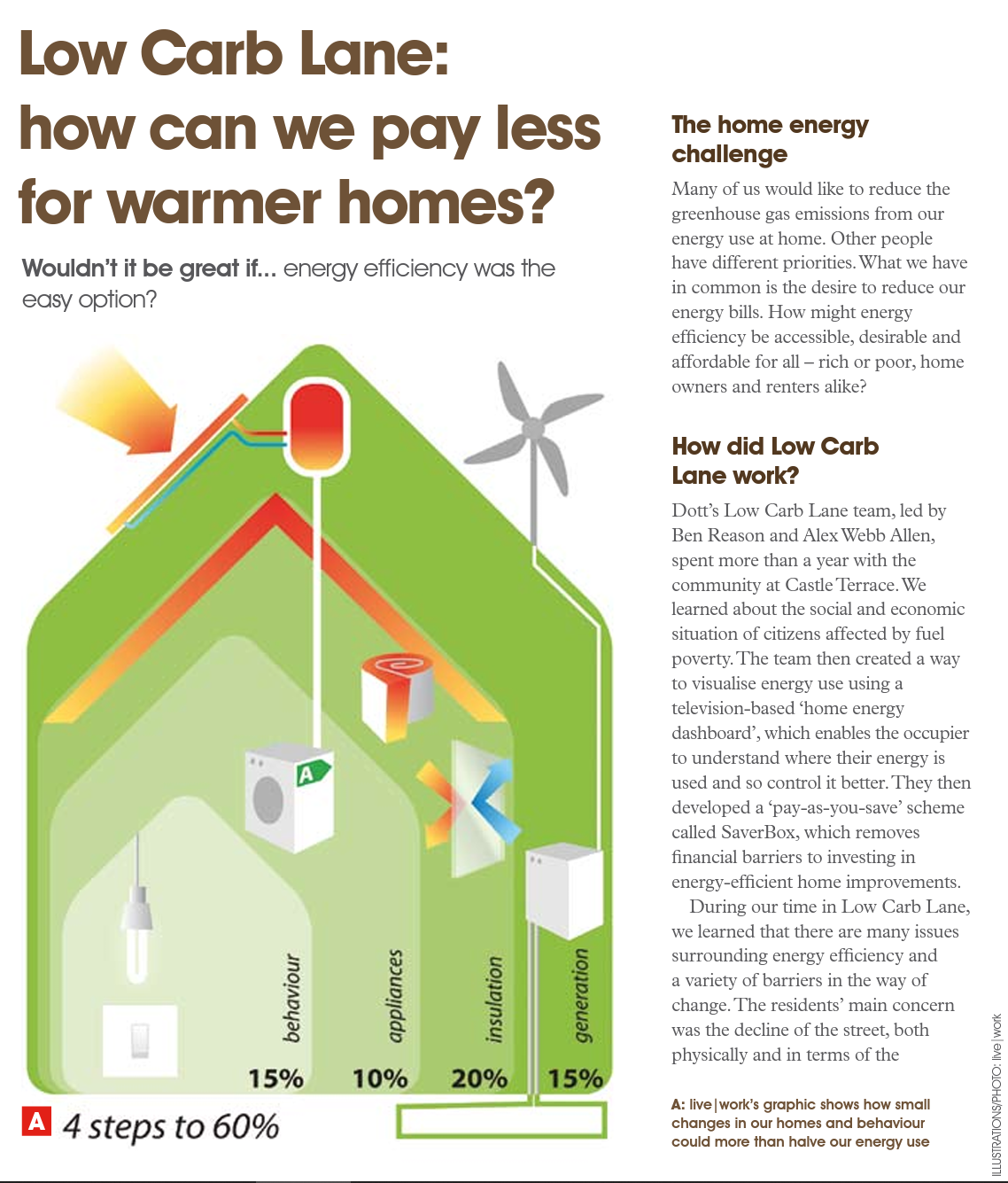 그러나 뉴캐슬(Newcastle) 근처 애슁턴(Ashington)의 캐슬 테라스(Castle Terrace)로 간 디자이너와 기타 전문가로 구성된 프로젝트 팀은 곧 주택 개선을 통한 가정 탄소 발자국(carbon footprint) 감축보다 약물사용, 방화, 악화된 임대주-세입자 관계, 저임금 등의 문제들이 더 시급한 문제임을 깨닫게 되었다.