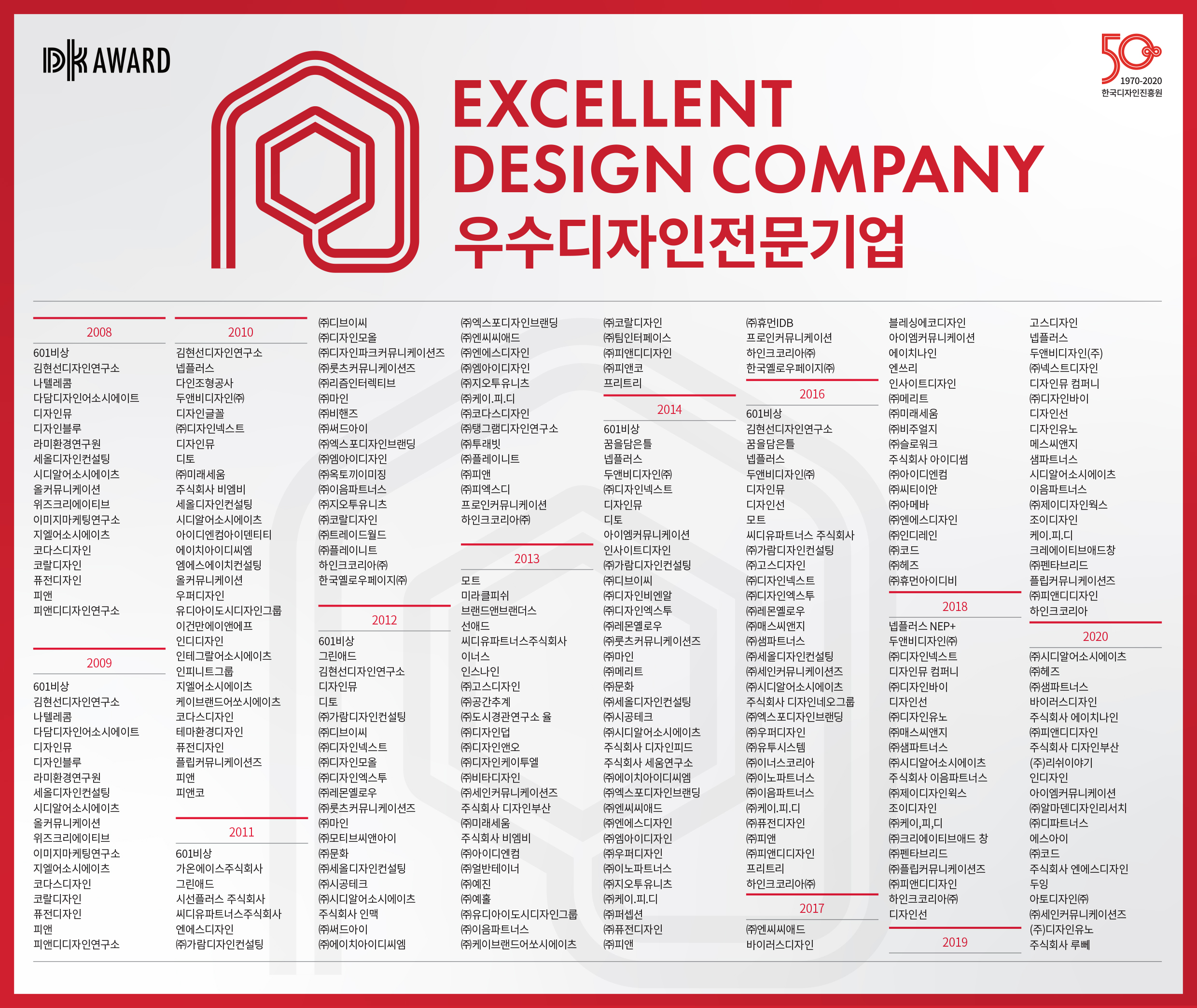 산업통상자원부(장관: 성윤모)와 한국디자인진흥원(이하 KIDP, 원장 윤주현)은 국내 디자인전문회사의 역량강화를 장려하고 경쟁력을 갖춘 글로벌 기업으로 성장할 수 있도록 매년 우수디자인전문기업을 선정한다. 2020 우수디자인전문기업은 2차례 평가(서류평가, 대면/발표 평가)를 통해 총 20개(선도 8개 사, 유망 12개 사)가 선정되었다.