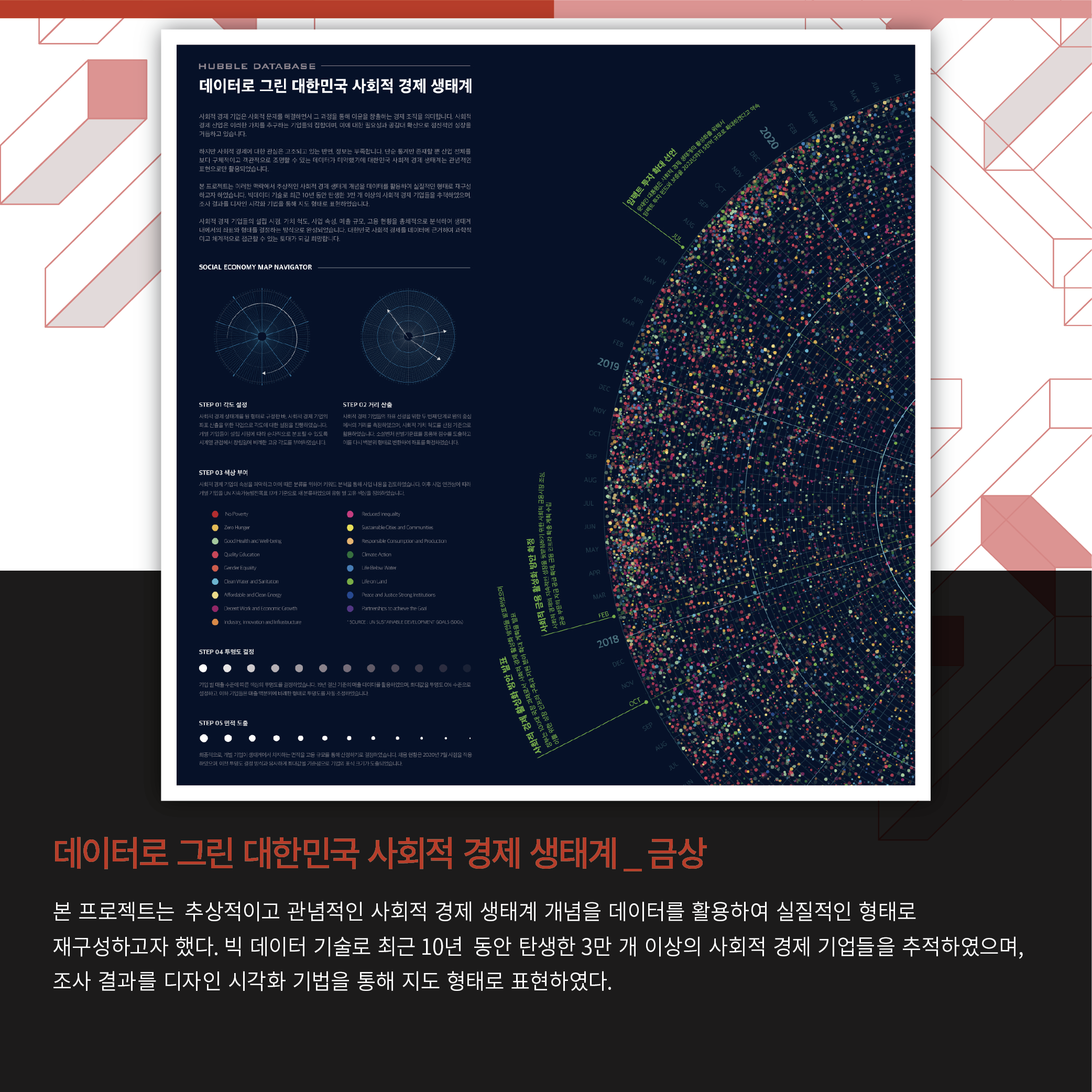 핀테크 기업의 빅데이터 기술력과 디자인전문스튜디오의 협업을 기반으로, 추상적인 사회적 경제 생태계를 어떠한 방식으로 구조화하고 시각화하였는지 구체적인 방법과 프로세스를 공유합니다.