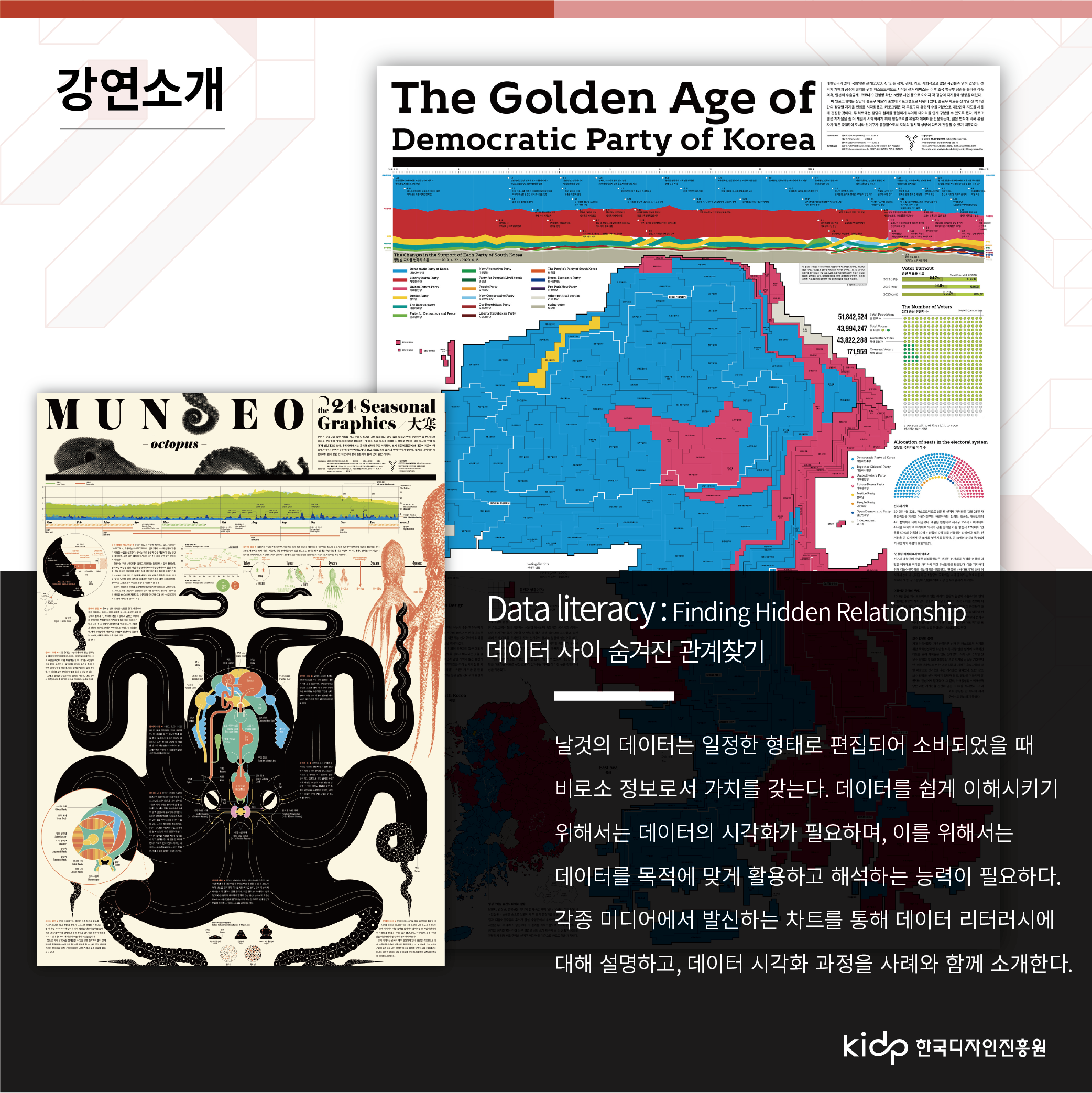 데이터 사이 숨겨진 관계 찾기. 날 것의 데이터는 일정한 형태로 편집되어 소비되었을 때 비로소 정보로서 가치를 갖습니다. 데이터를 쉽게 이해시키기 위해서는 데이터 시각화가 필요하며, 데이터를 목적에 맞게 활용하고 해석하는 능력이 필요합니다. 각종 미디어에서 발신하는 차트를 통해 데이터 리터러시에 대해 설명하고, 데이터 시각화 과정을 사례와 함께 소개합니다.