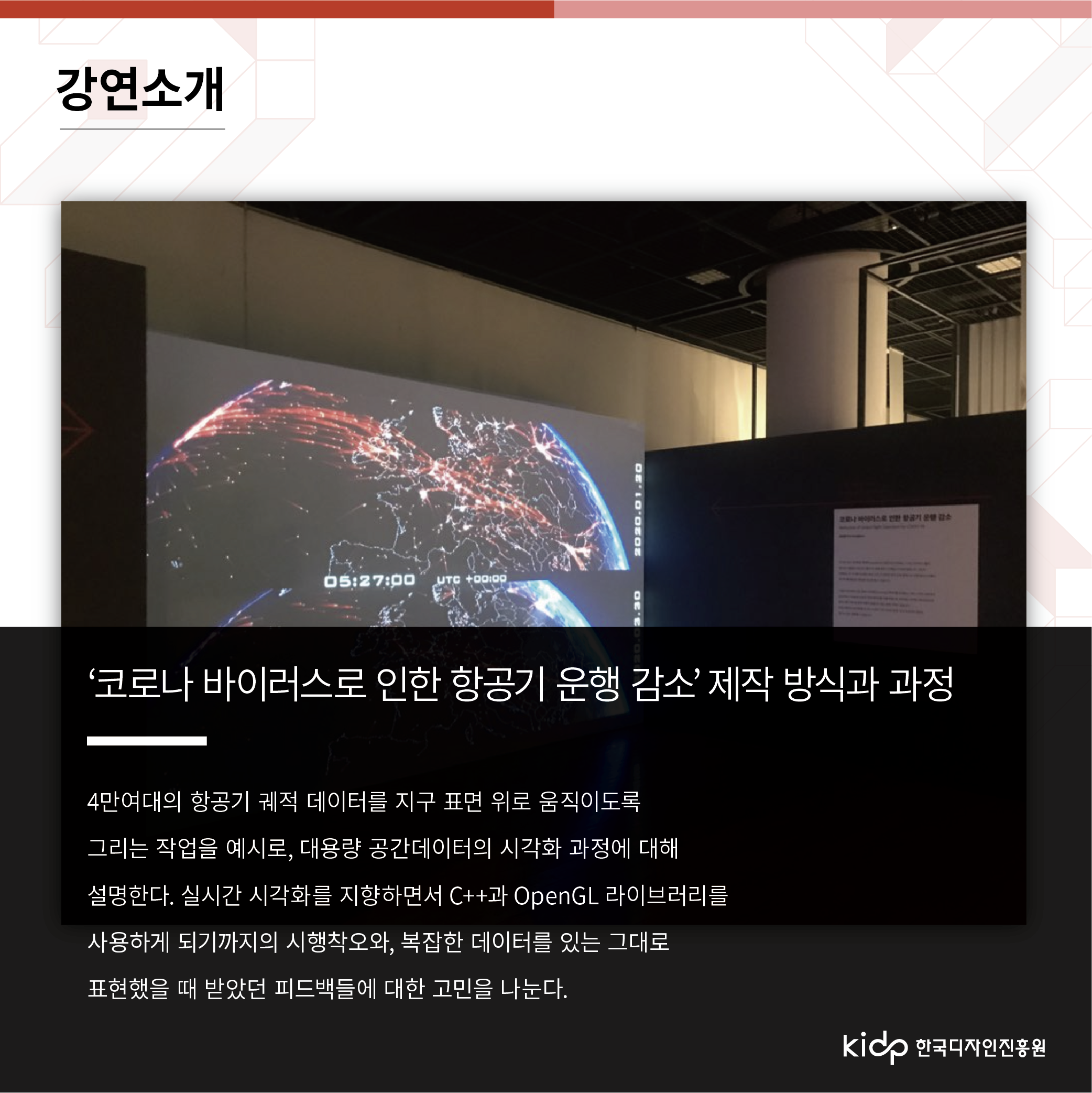 4만여대의 항공기 궤적 데이터를 지구 표면 위로 움직이도록 그리는 작업을 예시로, 대용량 공간데이터의 시각화 과정을 설명합니다. 실시간 시각화를 지향하면서 C++과 OpenGL 라이브러리를 사용하게 되기까지의 시행착오와, 복잡한 데이터를 있는 그대로 표현했을 때 받았던 피드백들에 대한 고민을 나눕니다.