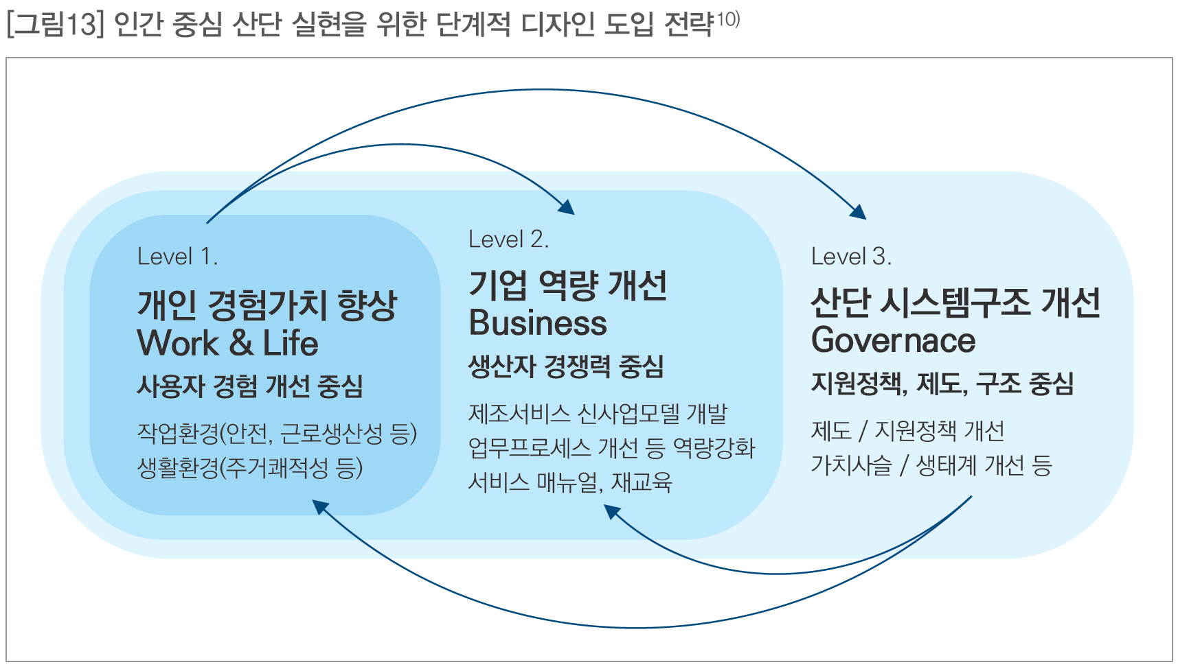 인간 중심의 산단으로 혁신하는 과정을 디자인 적용 대상을 기준으로 나눠 보자면 1) 개인의 경험가치를 증진할 수 있는 ‘일’과 ‘생활’과 직결되는 과제, 2) 기업의 역량 개선과 관련된 과제, 3) 산단의 시스템과 구조와 관련된 과제의 순서로 확장된다. 예를 들어 안전(환경, 범죄, 산업안전 등), 교통(출/퇴근, 이동 관련 활동), 편의(취식, 복지시설 등의 생활편의), 문화/여가(여가활동, 휴식, 문화활동 등), 교육(자기 계발 및 산학협력 등의 지식 활동) 등은 근로자와 근로자 가족 등 산단을 생활거점으로 하는 개인의 경험가치 향상에 직접적 영향을 미치는 과제들이다. 이러한 과제가 산단에서 디자인을 활용해 추진할 수 있는 첫 번째 레벨, 정책적으로 가장 접근하기 쉽다고 여겨지는 과제가 될 것이다.