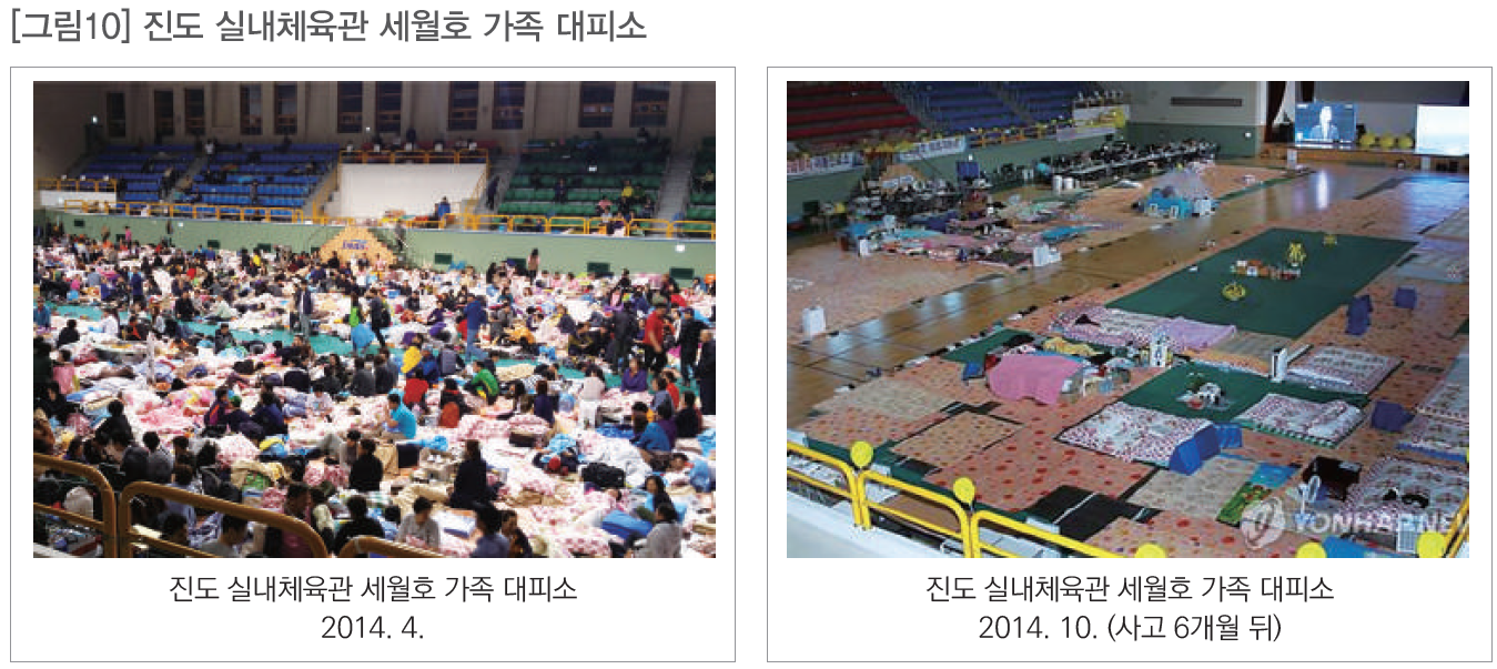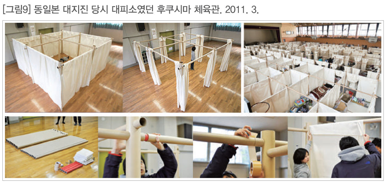 동일본 대지진이 발생했을 때 대피소에는 최소한의 자원으로 설치할 수 있는 조립형 칸막이 시스템이 신속하게 설치함으로써 가구별 프라이버시를 보호하면서 사고 후 당사자들의 정신적 심리적 후유증을 치유할 수 있도록 하였다. 이것은 일본을 대표하는 반 시게루라는 건축가의 설계로 만들어졌다. 표준화된 종이심, 종이 커튼, 접착테이프 등으로 순식간에 대규모의 대피소를 구축할 수 있다. 이에 비해 사고 초반 급하게 마련한 진도 실내체육관을 6개월이 지난 후까지도 그대로 이용하고 있던 사고자 유가족 대피소를 보면 우리나라의 대응체계가 얼마나 부족한지, 앞으로 안전을 위한 대응 시스템을 갖추는데 얼마나 많은 노력을 들어야 할 것인지를 단적으로 알 수 있다.