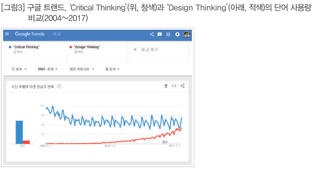불과 창업 9년 만에 세계 최대 숙박공유기업이 된 에어비앤비(Airbnb)는 기업가치 약 300억 달러(34조 원)로 세계 최대 호텔체인인 힐튼호텔의 기업가치를 넘었고 미국의 대표적 SNS의 하나인 핀터레스트의 기업가치는 13조 원을 넘었다. 에어비앤비, 핀터레스트, 국내기업으로는 배달의 민족, 렌딧(P2P금융 개인 신용대출 1위 기업) 등 국내외에 주목받고 있는 이들 기업들은 창업자가 디자이너라는 공통점이 있다. 이와 같은 맥락에서 사회 전반에 디자인싱킹(Design Thinking)의 중요성에 대한 논의가 일어나고 있다. 구글 트렌드 기준으로 최근 인터넷상에 ‘디자인 사고’의 키워드 활용이 비약적으로 많아지고 있는 것을 보면 경영학에서 강조해 온 분석적 사고(Critical Thinking)에 대응해 이를 보완하는 디자인 사고(Design Thinking)를 강조하는 동향이 나타난 것을 사실로 받아들여야 할 것 같다. ‘표현방법’이 아닌 ‘사고방식’으로서 디자인의 중요성이 새롭게 인식되고 있는 것이다.