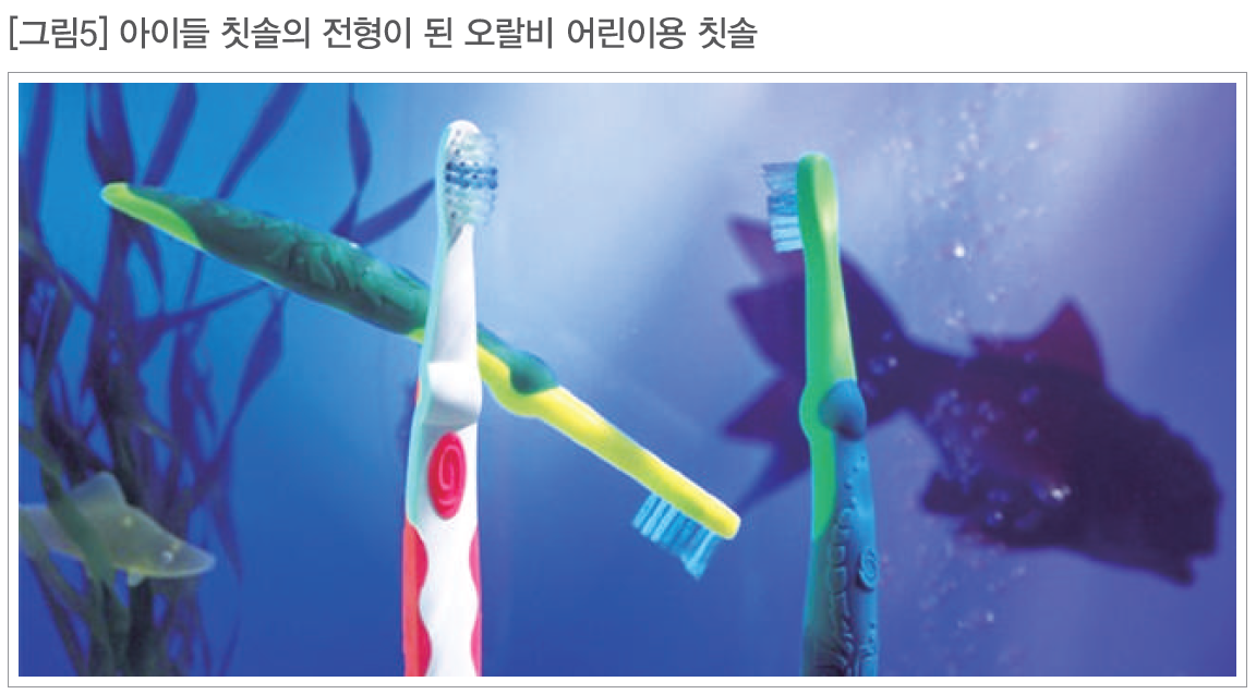 디자인기업 IDEO(미국)는 오랄비(Oral-B)를 위해 5~8세용 어린이 칫솔을 디자인하면서 아이들의 이빨 닦는 행동을 관찰함으로써 기존에 없던 새로운 칫솔을 만들었다. 1996년 이 제품 출시 전까지만 해도 아이들 칫솔은 어른 칫솔보다 작아야 한다는 정도의 개념이 있었을 뿐이었다. IDEO의 디자이너가 아이들을 관찰해 보니 실제로 아이들은 어른들처럼 칫솔을 손가락으로 잡는 대신 네 손가락과 손바닥을 함께 써서 주먹을 쥐듯 칫솔을 붙들고 있었고 얇은 칫솔대를 꽉 쥐지 못해 미끄러트리고 실패하는 모습을 발견할 수 있었다. 아이들이 더 쉽게 잡을 수 있게 하려면 어른의 칫솔대 보다 더 두꺼워야 한다는 결론을 얻었다. 그 결과 만지작거리기 좋은 느낌의 통통한 고무 손잡이를 가진 어린이 전용 칫솔이 탄생했다. 칫솔을 사용한 역사 이래 불과 몇 년 전까지도 우리는 아이에게 필요한 칫솔이 무엇인지 아이 입장에서 생각해보지 못했던 것이다. 오히려 우리가 아이었기 때문에 겸허하게 아이에게 필요한 것을 알아낼 생각을 하지 못했는 지도 모른다.
