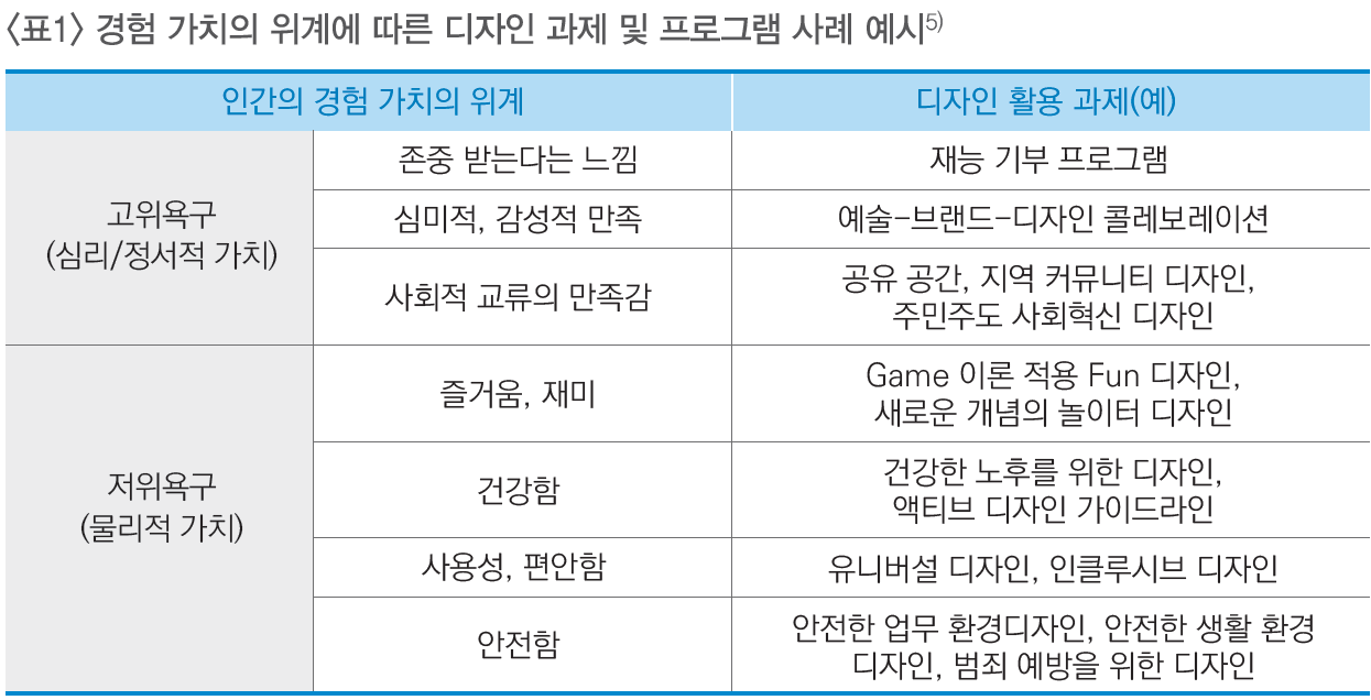 산단에서 디자인을 활용할 때 어떤 주제를 먼저 다루는 것이 좋을까? 디자인이 활용되고 있지 않던 영역에서 디자인을 처음 활용할 때 좀 더 효과적인 분야 또는 주제가 따로 있을까? 이것은 인간의 심리에서 착안점을 얻을 수 있을 것 같다. 매슬로는 욕구 단계설을 통해 인간의 욕구가 일련의 단계를 형성하고 있으며 하나의 하위 욕구가 충족되면 위계상 상위 층의 다른 욕구가 생겨나는 인간 심리의 특징을 설명하고 있다. 인간의 욕구가 상위 층으로 점진적으로 상승한다면 디자인의 활용 과제 역시 그에 따라 단계적으로 고도화되는 로드맵을 갖는 것이 바람직할 것이다.