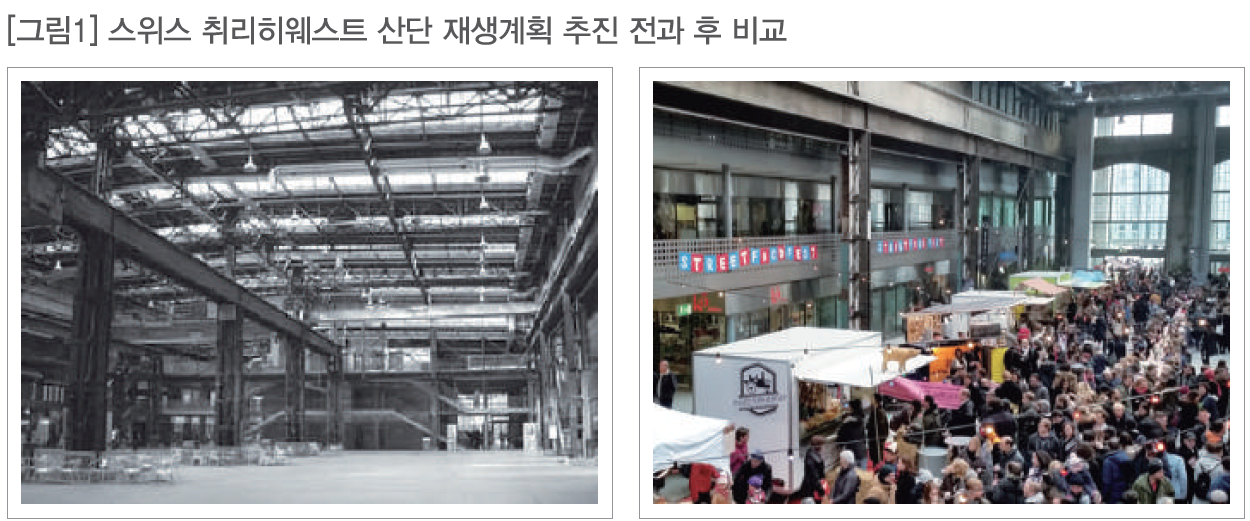 스위스 취리히웨스트(Zurich-West, Switzerland)는 선박, 터빈, 모터 등 각종 장비와 기계를 생산하는 중공업 공장의 집적지였다. 1980년대 탈산업화로 인하여 제조산업이 쇠퇴하면서 지역 전체가 쇠퇴의 길로 들어섰다. 1996년부터 산단 재생계획의 논의가 시작되어 산업시대 유산을 재생의 수단으로 활용하여 문화예술 도시로 변모하게 된다. 산업을 넘어 문화예술, 비즈니스, 스포츠, 엔터테인먼트가 접목된 생태계로 탈바꿈한 것이다. 100년 된 맥주 양조장이 8개의 갤러리가 있는 복합문화공간으로 바뀌었고 미래예술센터, 뢰벤브로이 예술단지, 펄스 5(Puls5), 프라이탁 매장, 제철공장 등 다양한 환경이 형성되었다. 첨단산업 집적단지인 테크노파크를 중심으로 창업보육센터, 콘퍼런스 센터 등 지식과 기술 교류 및 지원을 위한 다양한 시설이 마련되었고 이러한 시스템을 바탕으로 중소기업에 대한 기술이전과 산・학・연의 공동연구를 효율적으로 지원할 수 있게 되었으며, 투자자와 금융기관, 외부기관을 통한 다양한 재정지원을 확보하게 되었다. 많은 공공 공간을 확보하여 교육, 의료, 서비스, 여가, 소비와 같은 필수적인 기반시설을 마련하여 세계적으로 삶의 질이 매우 높은 지역으로 변모하였다.