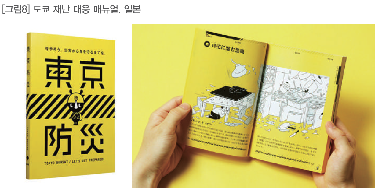 도쿄의 재난 대응 매뉴얼은 안전 분야에서 꽤 주목받고 있는 모범적 사례이다. 지진으로 바닥이 흔들리는 위급 상황에서 글로 설명된 매뉴얼은 읽히지도, 머릿속에 들어오지도 않을 것이다. 도쿄 재난대응 매뉴얼은 간결한 이미지로 표현되어 위기의 순간에 바로 이해하고 지시에 따라 행동할 수 있도록 돕는다.