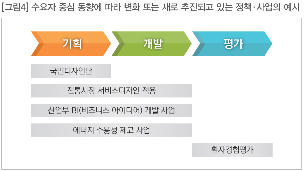 정부 R&D에 있어서도 비즈니스아이디어 사업(지식서비스 BI연계형 사업)이 신설되고 서비스디자인 기획을 통해 비즈니스모델을 수립한 후에 필요한 기술을 개발하는 수요자 중심의 기획, 개발이 도입되었다. 디자인과 관련이 없을 것처럼 보이는 에너지산업의 연구개발에서도 ’16년부터 기술 수용성을 높이기 위한 방법의 연구(에너지기술 수용성 제고 및 사업화 촉진 사업)에 서비스디자인 방법을 사용하고 있다.