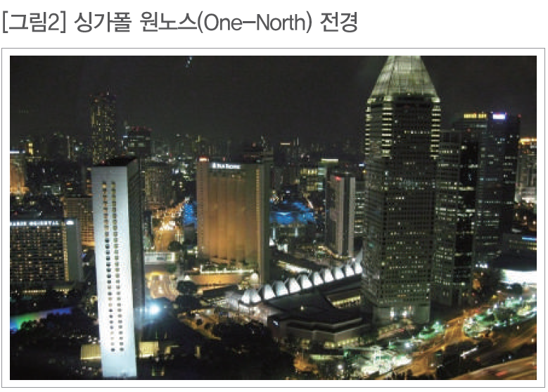 싱가포르 중심부에 JTC(주롱도시공사)의 주도로 원-노스(One-North) 산업단지가 구축되고 있다. 2001부터 2020까지 20년 간 3단계로 나누어 11조 원이 투입되는 대규모 사업이다. 200ha 면적에 개발되는 산업단지에는 일과 생활, 놀이, 학습, 연구가 한 자리에서 적절히 조화를 이루는 복합 연구단지가 조성될 계획이다. 그래서 이름도 ‘워크, 리브&플레이@원노스(Work, live and play@One north)’이다. ‘원노스에서 일하고, 살고, 삶을 즐기자’는 의미이다. 최첨단 의학도시, 문화의 도시, 미래 미디어 허브 도시로서 가치를 추구한다.