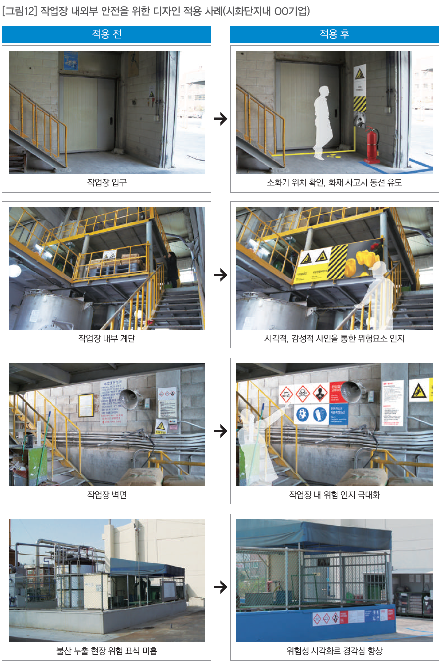 2013년 한국디자인진흥원, 김현선디자인연구소는 산단에 잦은 치명적 안전사고를 디자인 방법으로 줄이기 위한 시범사업을 실행한 바 있다. 불산 유출 사고가 반복해서 나면서 사망사고까지 발생했던 시화단지에 불산 제조기업의 작업장 내 위험을 인지하고 경각심을 줌으로써 안전한 작업장을 만들 방법을 찾는데 서비스디자인 방법을 활용했다. 외국인 근로자가 늘고 있어 문자로 표현된 안전 경고는 시급히 시각적 표식으로 대체해야 할 필요가 있었다. 근로자의 일과를 시각화하는 고객여정맵을 통해 독극물인 불산이 제조되고 유통되는 전체 과정 중 언제, 어디에, 어떤 위험 요소가 있는지를 확인하였다. 가장 위험요소가 높고 이용도가 높은 장소에 컬러, 심벌마크, 포스터 등 경각심을 환기하는 시각적 요소를 배치하고 독성 유출을 확인할 수 있는 노즐과 같은 제품을 적용하여 보다 안전한 작업장을 만들 수 있는 다양한 아이디어를 도출하였다. 아이디어 중 보호구착용 유도사인, 위험물질이 흐르는 부관 주의 표식, 위험물 주변 표시사인, 주의를 요하는 구간 구분선 등을 적용한 후 그 효과를 검증하였다. 보호장구 착용 중요성에 대한 인식 개선(적용 전 31%→적용 후 64%) 등의 성과가 있었다.