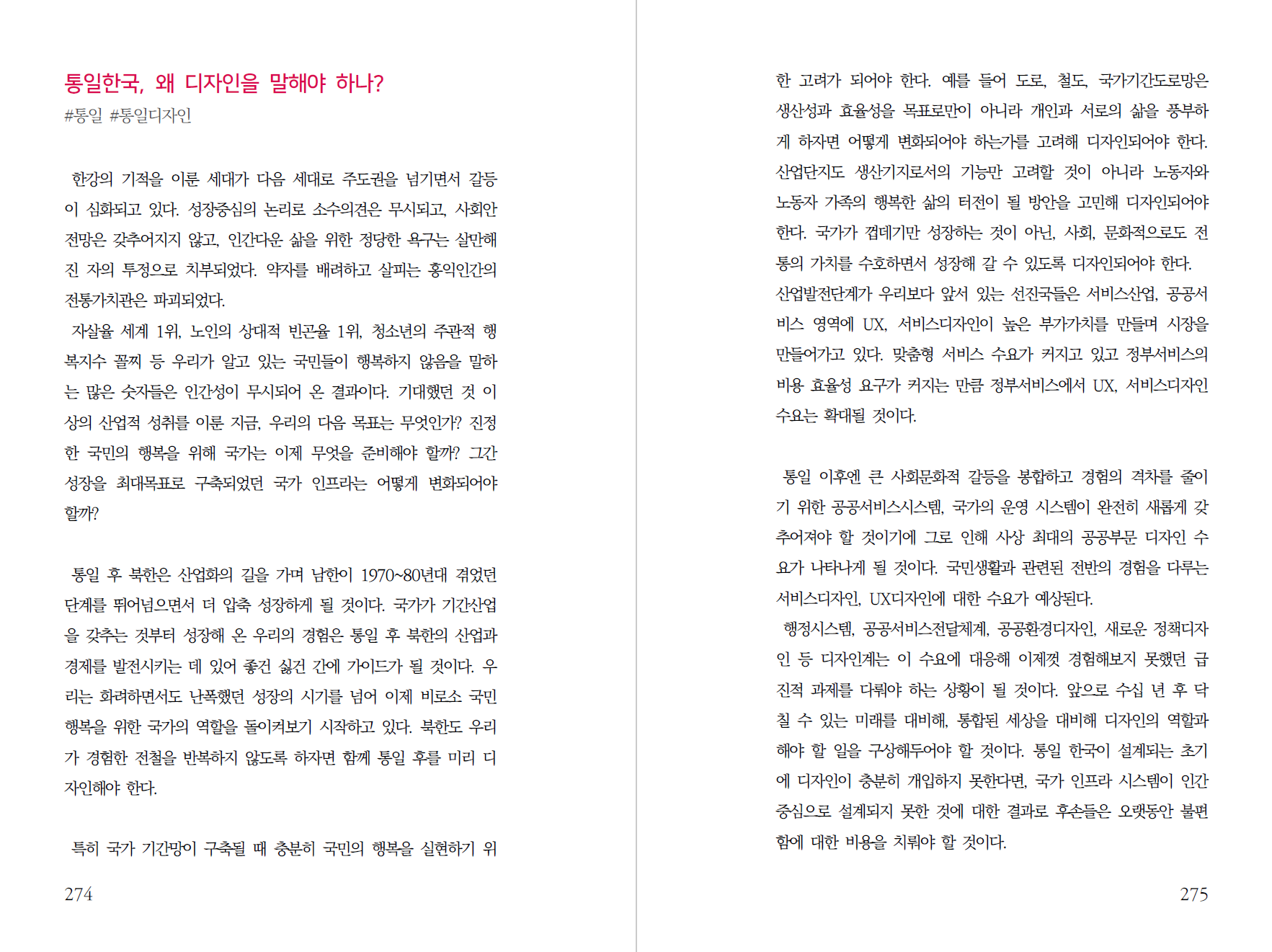 성장에 초점을 맞추다 보면 인간 본연의 마음속에 숨겨진 욕구를 찾기보다는 기술 중심으로, 효율성 중심로 번쩍번쩍하는 목표로만 내달리게 된다. 그래서는 국민이 행복한 나라를 만들 기회를 잃게 될 수 있다. 북한도 우리가 그간 놓쳐왔던 인간 중심의 가치를 또 놓치게 될 수 있다. 통일한국은 국민이 행복한 나라여야 한다. 그러자면 디자인이 필요하다.