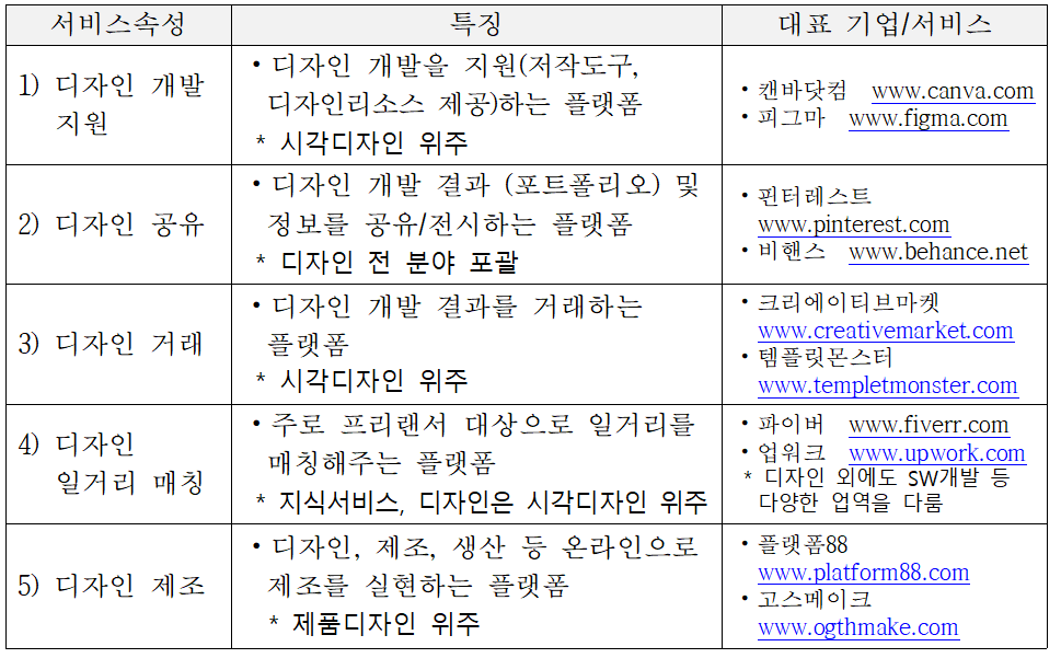 1) 디자인 개발 지원 플랫폼, 2) 디자인 공유 플랫폼, 3) 디자인 거래 플랫폼, 4) 디자인 일거리 플랫폼, 5) 디자인 제조 플랫폼 이다.