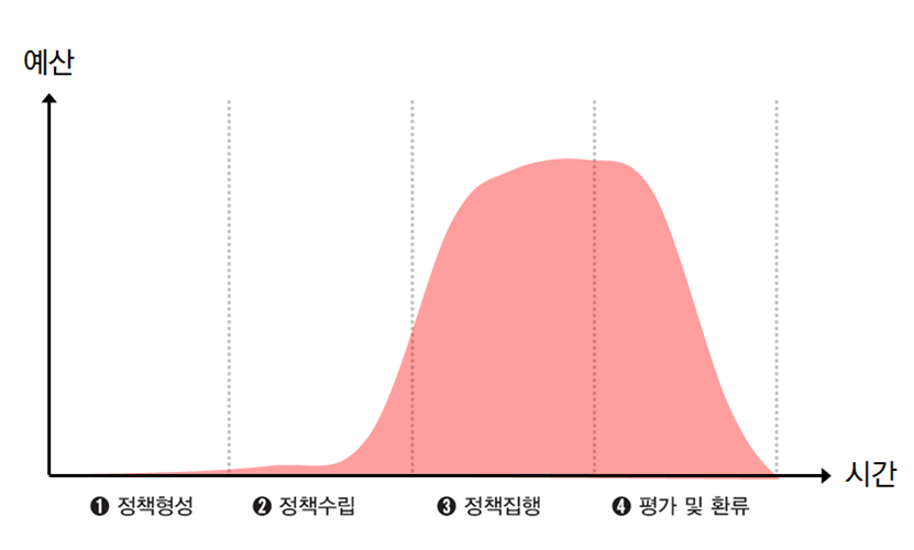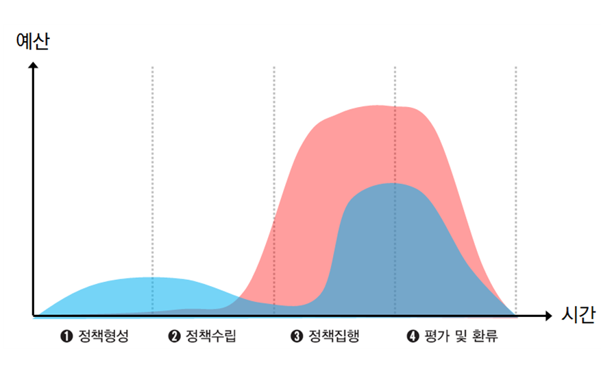 면적은 사용되는 예산의 총량을 의미함. 실행과 홍보, 환류에 많은 예산이 사용됨