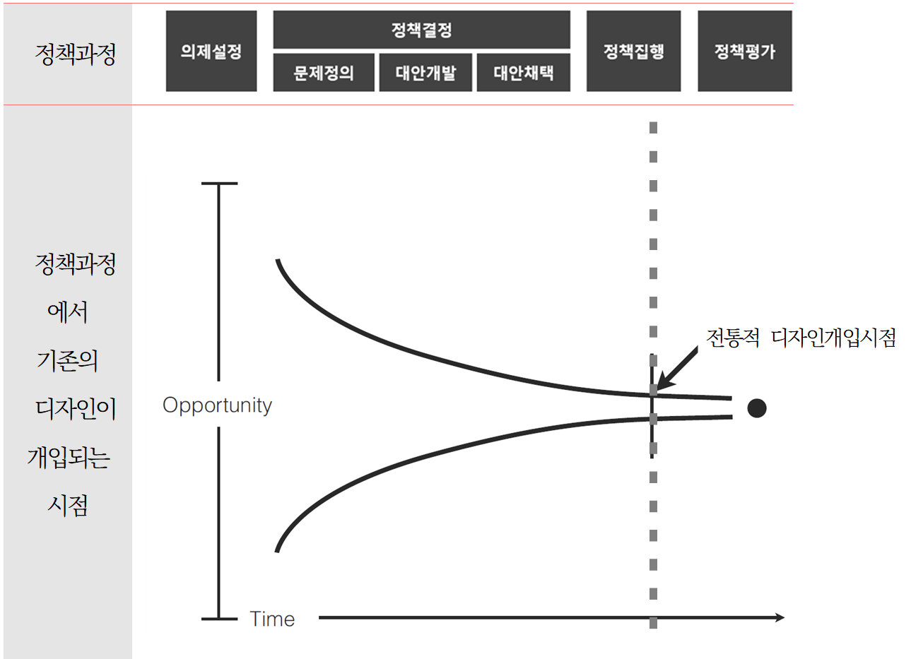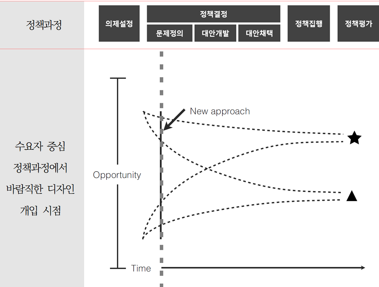 다음 그림은 디자인이 정책과정의 초반부에서 역할을 할수록 더 큰 기회를 갖게 된다는 점을 도식으로 표현한 것이다.