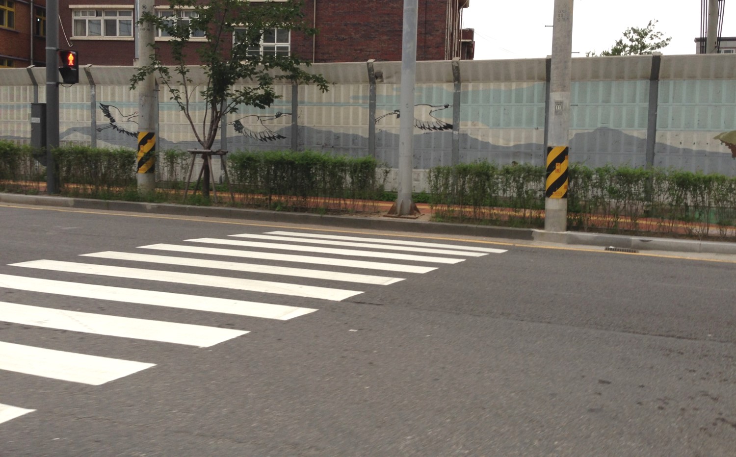 이것은 수원지방법원 앞 횡단보도의 사진이다. 지금은 고쳐졌겠지만, 당시는 사용할 수 없는 횡단보도였음을 알 수 있다. 지자체의 도로, 횡단보도, 신호등, 나무식재를 담당하는 부서가 서로 달라 사전에 협의 없이 각자의 역할을 한 결과다.