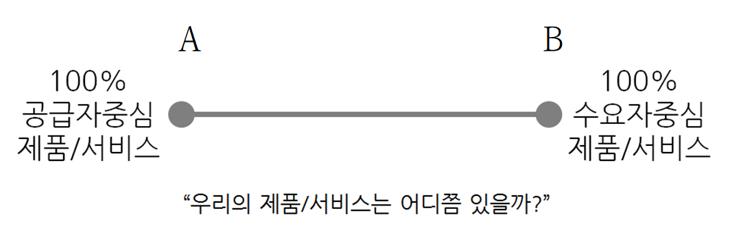 그림처럼 A지점은 100% 공급자 중심의 제품서비스를, B지점은 100% 수요자 중심의 제품서비스를 의미한다고 가정해 보자. 초기에는 전적으로 공급자의 관점인 A지점에서 제품서비스를 제공했겠지만, 점차 수요자 중심의 B의 방향으로 이동하게 될 것이다. 아주아주 조금씩 이동하고 있다고 해도 어쨌든 변화는 하고 있기에 공급자들은 ‘우리는 늘 수요자 중심의 혁신을 해오고 있다’는 생각에 빠지게 되는 것이다. 그것이 사실이라고 해도, 그 결과가 충분히 수요자 중심의 제품과 서비스라고 말할 수 없다. 어떤 제품과 서비스가 수요자 중심인가 아닌가의 판단은 수요자가 하는 것이기 때문이다. 그 결과는 8%, 앞서 언급했던 배인앤컴퍼니의 조사 결과로 설명된다. 수요자 중심이 된다는 것은 너무나 어려운 일이다.