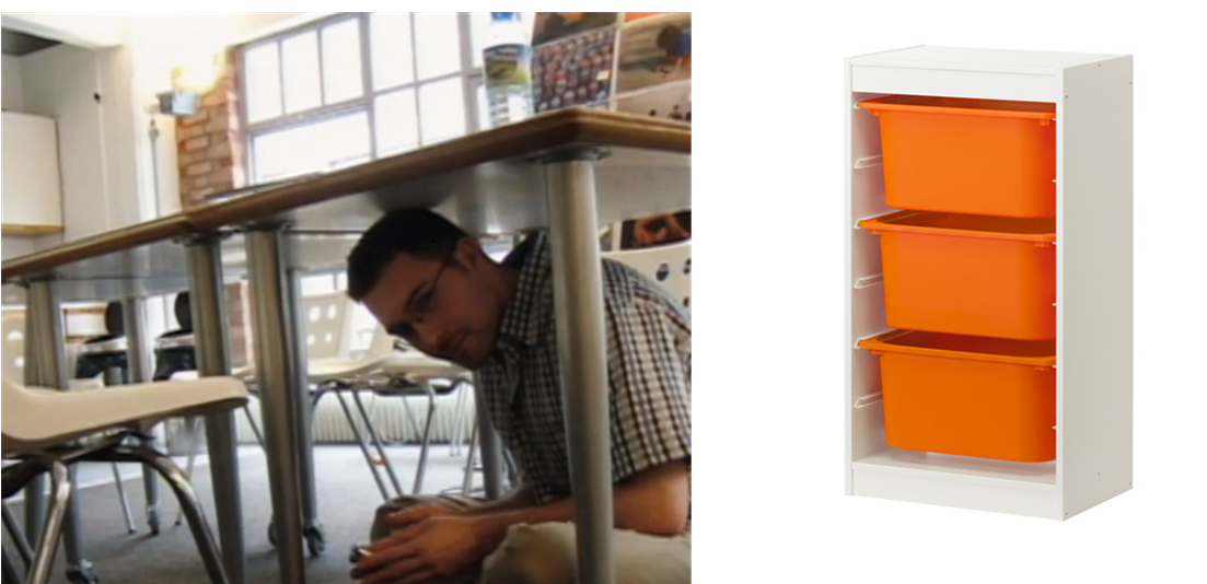 이케아의 디자이너 그레엄 핀들리(Graeme Findlay)가 책상 밑에 있는 아래 사진은 자신의 아이가 체험하고 있는 세계로 들어가 보기 위해 연구 중인 장면이다. 아이들을 위한 수납장은 지금까지 천편일률적으로 네모난 서랍들을 하나로 묶어놓은 모양이었다.