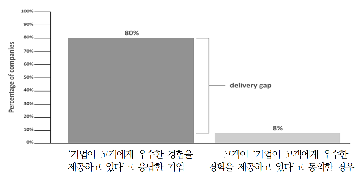 컨설팅회사 배인앤컴퍼니(Bain & Company, Inc.)가 2005년 세계 362개 기업의 임원들을 대상으로 조사한 결과, 응답자의 95%는 "우리 회사가 고객지향적인 전략을 사용하고 있다"라고 답했다. 또 80%의 기업들은 자기 회사가 경쟁사보다 차별화되고 우수한 상품, 서비스를 고객에게 제공한다고 믿고 있는 것으로 나타났다. 하지만 기업들의 믿음과 고객의 인식은 너무나 달랐다. "당신과 거래하는 기업이 경쟁사보다 차별화되고 우수한 상품과 서비스를 제공하고 있느냐"는 똑같은 질문에 대해 고객 중 불과 8%만이 "그렇다"라고 응답했다. 이 결과를 통해 서비스의 제공자인 기업은 고객의 속마음에 숨어있는 욕구를 포착해 내는 데 분명한 한계를 갖고 있음을 알 수 있다. 제공자는 제공자로서 자기 입장과 시각을 가지고 있어 고객의 마음을 헤아리고 배려하기 어려운 것이다.