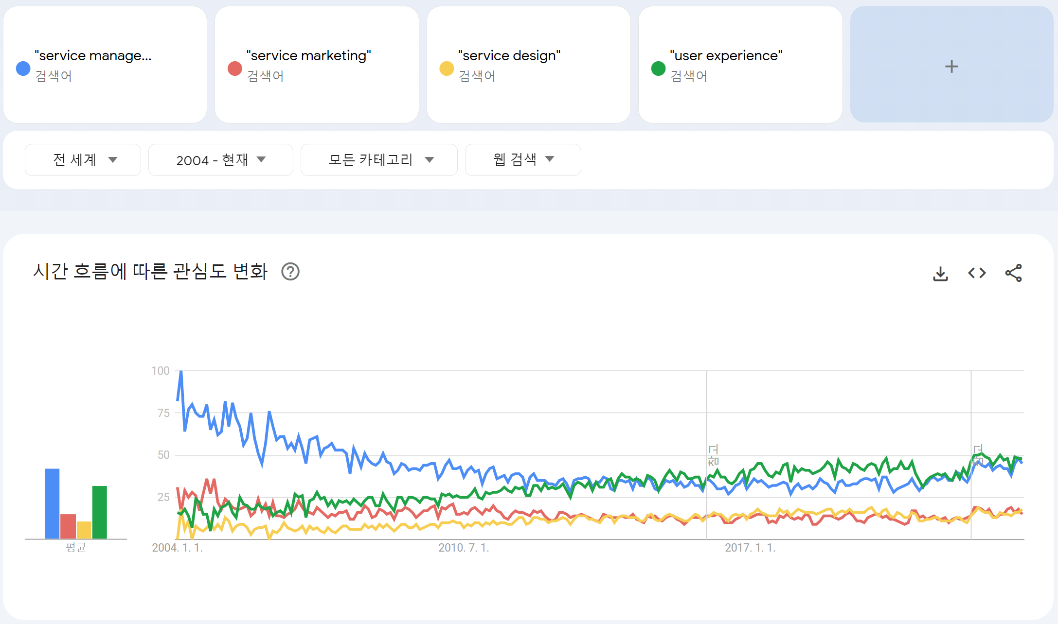 구글 트렌드(https://www.google.com/trends)의 ‘키워드 간 인기도 추이’ 만을 가지고 단편적으로 서비스 혁신을 위한 학문의 동향을 말하는 것은 무모한 일이겠지만, 어쨌든 이것은 사람들이 특정 개념에 대해 얼마나 관심이 있는가를 나타내주는 결과라고 할 수 있다.