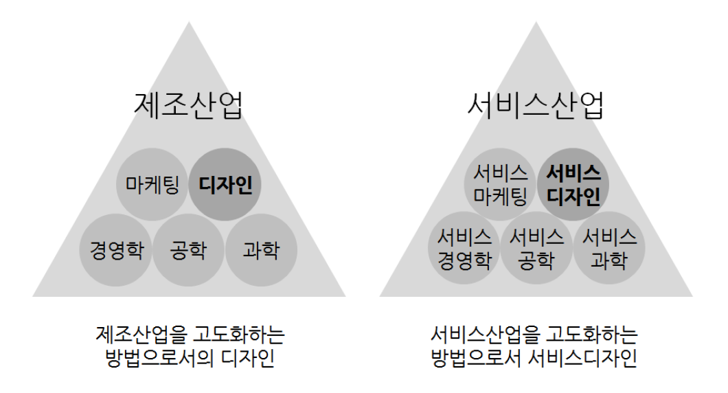 서비스산업의 중요성이 커짐에 따라 경영, 마케팅, 공학, 과학, 디자인 각자의 영역은 서비스산업의 특성에 맞추어 발전되었다. 서비스 혁신을 위한 학문은 ‘서비스디자인’ 외에도 ‘서비스사이언스’, ‘서비스경영’, ‘서비스마케팅’, ‘서비스엔지니어링’ 등이 있다. 제조산업에서 경영, 마케팅, 디자인이 각자 제 역할을 해 온 것처럼 서비스산업을 혁신하기 위한 목적으로 다양한 학문이 서로 간에 차별점을 갖고 다른 역할을 하며 발전하고 있다.