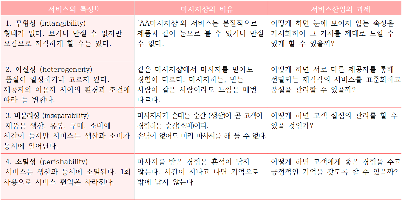 * 표 중 서비스의 특징 : ‘서비스경영’, 정기영, 2009 중 발췌