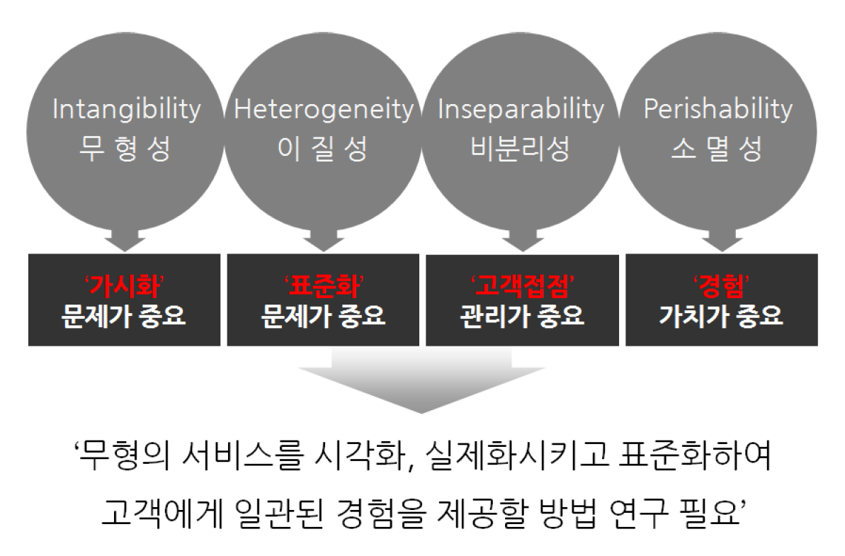 서비스산업의 본질을 따져보면 서비스혁신 방법으로 디자인에 주목해야 할 이유가 더 분명해진다. 제조산업과 비교할 때 서비스산업은 형체가 없는 무형성(intangibility), 표준화와 규격화가 힘든 이질성(heterogeneity), 생산과 구매, 소비가 동시에 일어나는 비분리성(inseparability), 보관과 저장이 불가능한 소멸성(perishability) 의 특징을 갖는다.