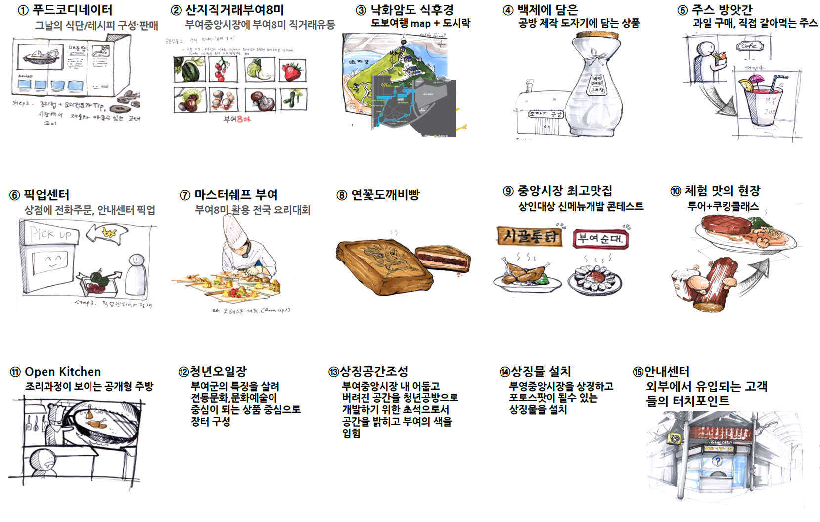 한국디자인진흥원은 그간 전통시장 사업의 한계를 넘어 향후 고객 중심의 매력적인 전통시장으로 변화시키는 디자인 주도의 전통시장 혁신 사례를 만들기 위해 디자인기업인 알마덴디자인리서치와 함께 서비스디자인 모델을 제시하고 이를 부여시장에 시범 적용하였다. 현재의 시장 유형 및 미래 추구 방향에 따라 서비스플라워* 중 어느 요소에 주력해야 할지 판단할 수 있는 전략 맵 등 서비스 개발에 활용할 수 있는 다양한 방법론을 개발하고 전통시장의 본질적 역량과 고객 특성 분석에 기반한 지역 맞춤형, 고객 중심의 시장 활성화 전략을 개발하여 수요자 중심의 전통시장 활성화를 위한 사업 모델을 제시하였다. 제안된 제품서비스 모델은 다음 15개이다.