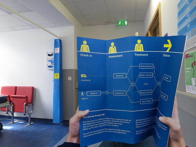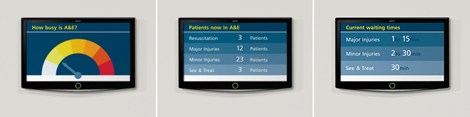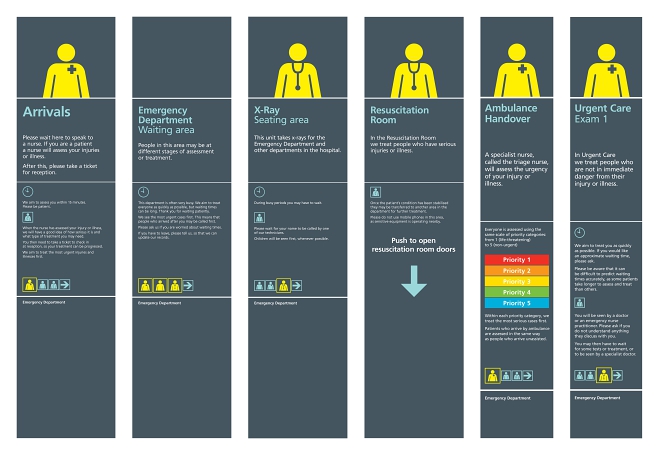 영국의 런던과 사우샘프턴에 있는 두 곳의 공공병원을 대상으로 진행된 이 프로젝트에서, 피어슨로이드는 환자와 보호자의 불안을 줄이고 의료진에게는 안전한 진료 환경을 만들기 위한 해법을 디자인했다. 먼저 환자를 위해 응급실의 상황을 알기 쉽게 전달하는 안내 패키지가 개발되었다. 응급실 내 진료 과정을 ‘접수, 평가, 치료, 결과’의 네 단계로 나눠 환자가 현재 자신이 어느 단계에 있는지, 또 응급실 내의 상황이 얼마나 긴박하게 돌아가고 있는지와 같은 정보를 안내한다.