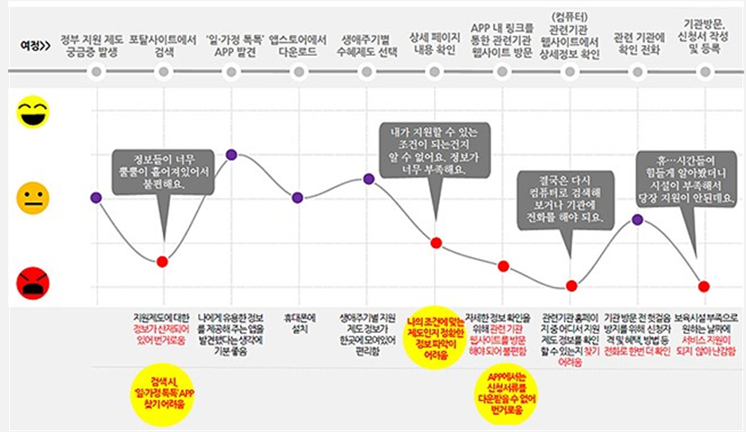 페르소나는 ‘다양한 수요자들의 대표적인 특성과 요구사항을 구체적 실체가 있는 특정인으로 의인화하는 것’을 말한다. 그래야 수요자를 좀 더 구체적이고 현실적인 대상으로 이해하는 데 도움이 되기 때문이다. 이 과제의 경우 페르소나가 ‘남편과 네 살 아들을 둔 부부 연소득 3,500만 원 정도의 34세 전업주부로, 경제적으로 안정된 양육을 하기 위한 재취업을 고민하는 여성’이었다. 이 여성이 정부 지원 제도에 대해 궁금증이 생기는 순간부터, 최종적으로 지원제도를 신청하는 그 순간까지 경험 여정 맵을 작성해서 단계별로 수요자가 느끼는 감정, 욕구 등을 자세하게 분석한다. 이런 단계를 거쳐 정리된 주요 문제점으로 수요자와의 접점이 있는 곳을 활용한 정확한 홍보, 단순 정보 제공이 아닌 수요자의 조건에 맞는 정보 제공, 원스톱 신청 및 서류 제출 등이 꼽혔다. 이후 발견된 문제마다 그에 맞는 개선 방향을 정리하였다.