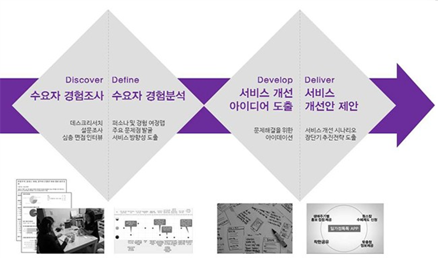서비스디자인 프로세스는 ‘더블 다이아몬드 모델’이라 불리는 단계를 거쳐 진행된다. ①수요자 경험조사를 통해 가능한 한 관련된 모든 이해관계자의 목소리를 듣는다. 그리고 다양한 가능성을 두고 폭넓게 수집한 정보들을 가지고 ②문제점에 대한 정의를 내리는 수요자 경험분석을 시도한다. 그 후 이를 바탕으로 다시 다양한 ③서비스 개선 아이디어를 끌어낸 후, 최종적으로 ④실제 적용 가능하고 우선 적용되어야 할 핵심 아이디어를 정리해 서비스 개선안을 제안하는 순으로 이루어진다.