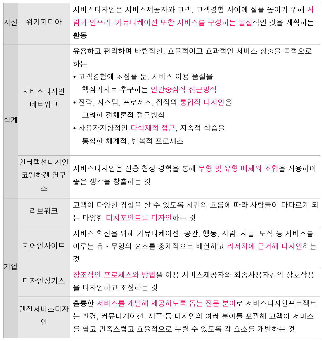 <서비스디자인에 대한 각 계의 다양한 정의>
