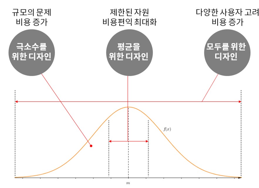신제품을 개발할 때 ‘누구를 위해 디자인할 것인가’를 결정해야 한다고 치자. 극소수의 사용자를 위한 디자인에서부터 모두를 위한 디자인까지 선택할 수 있다고 할 때, 특수한 경우를 제외하고는 비용편익이 가장 높은 ‘평균을 위한 디자인’을 하게 된다. 모두를 위한 디자인이 가장 많은 사용자에게 영향을 미치는 것이니 당연히 가야 할 방향이지만, 이것을 실현하자면 다양한 사용자를 고려해야 하고 그러기에는 많은 비용이 들기 때문에 지금까지 그렇게 할 수 없었던 것이다. 기업들은 제한된 자원을 활용해 수요층이 가장 많은 구역에 있는 평균 사용자를 대상으로 제품서비스 개발을 하고 시장에 내놓아 이익을 극대화하는 방법으로 경영을 해왔다.