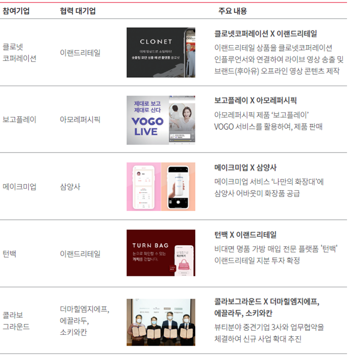 이 프로그램은 아모레퍼시픽, 이랜드, 클리오, 에프앤에프, 무신사 같은 대·중견기업, 선도기업이 성장 가능성이 큰 기업을 함께 선정하고, 협업의 기회를 마련, 직접 투자하는 등 산업을 이끄는 선두기업들이 적극적으로 참여한다는데 차별점이 있다.