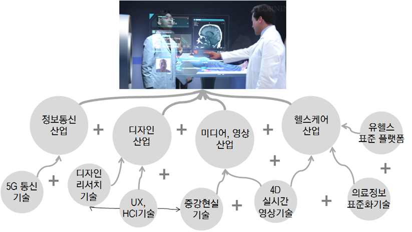 위 그림은 대형 디스플레이를 통해 중국에 있는 뇌질환이 의심되는 환자를 미국에서 실시간으로 협동 진료하는 장면을 그려낸 코닝사(강화유리제조사. 아이폰의 강화유리인 고릴라를 제조한 기업이다.)의 비래 비전 영상의 한 장면이다. 이것은 헬스케어 산업, 미디어/영상 산업, 정보통신산업, 통신기술, HCI, 증강현실기술, 4D 영상기술, 의료정보 표준화, U헬스 표준 플랫폼, UX, 디자인 리서치기술 등 수많은 산업과 기술이 연관되어야 실현 가능한 것임을 알 수 있다. 이 비전이 우리의 욕구에 부합하는 매력적이고도 타당한 것일수록 사람들은 그것을 실현할 방법을 찾게 될 것이고 그 과정에서 필연적으로 다양한 형태의 기술, 산업 융합이 일어나게 될 것이다. 이렇게 인간 중심, 인간의 욕구를 중심에 두는 접근은 자연스럽게 서로 다른 영역의 융합을 가져온다.