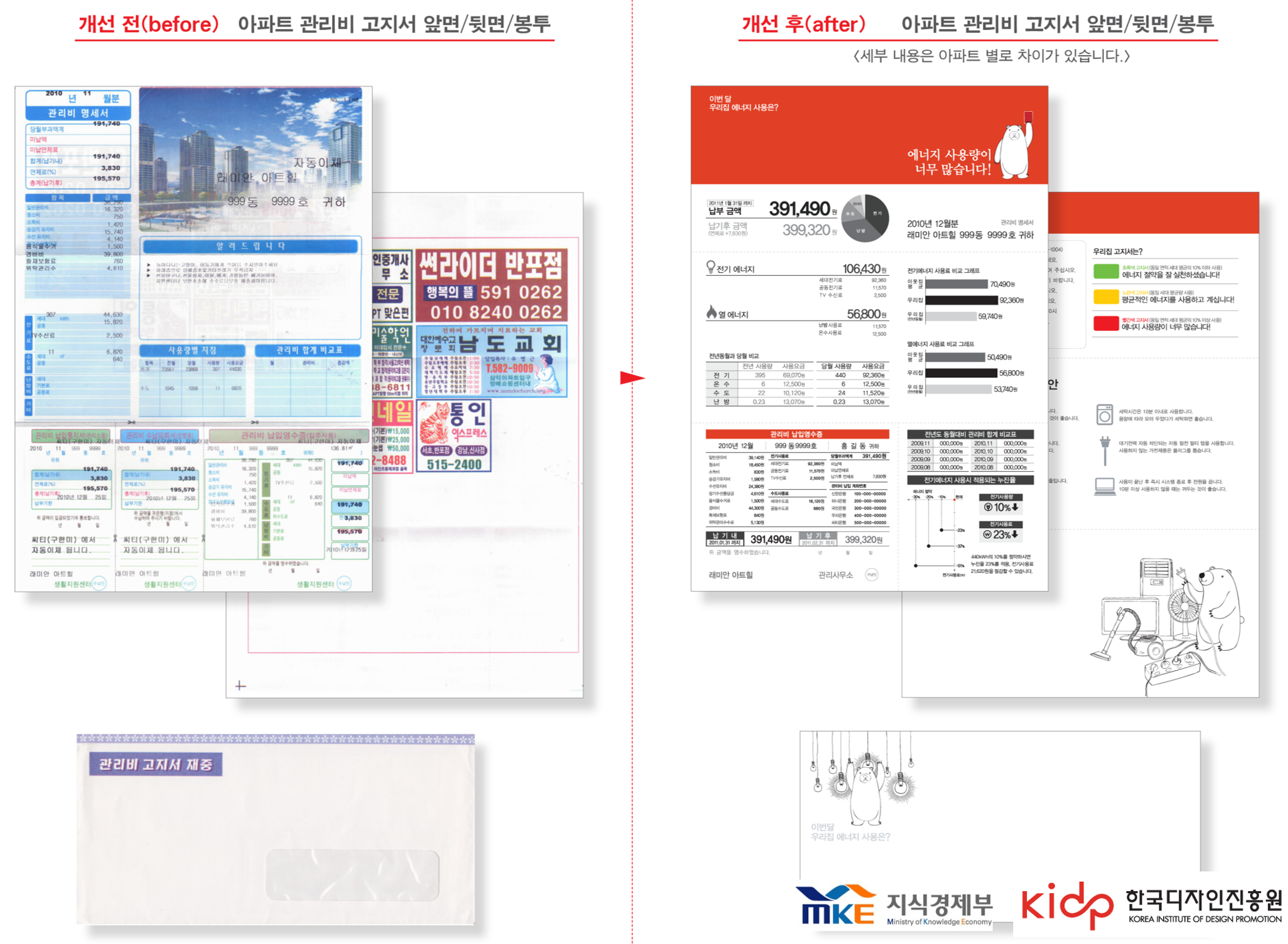 고지서는 2011년 1월~3월간 방배동 OO아파트 600 가구를 대상으로 배포되었고 월평균 10%의 전기료 절감 성과를 냈다. 당시 한 해 전국 주택용 전기 사용액 7.6조 원의 10%면 연간 약 7천6백억 원의 예산 절감을 할 수 있음을 알 수 있다. 이 사례는 2011년 국제디자인공모전 IDEA어워드 파이널리스트에 선정되었고 2011년 11월 행정제도 선진화 우수사례 경진대회에서 국무총리상 금상을 수상했고, 2014년 에너지 절약 촉진대회에서는 이 아이디어를 적용한 에너지 절약형 고지서가 대통령 표창을 받았다.