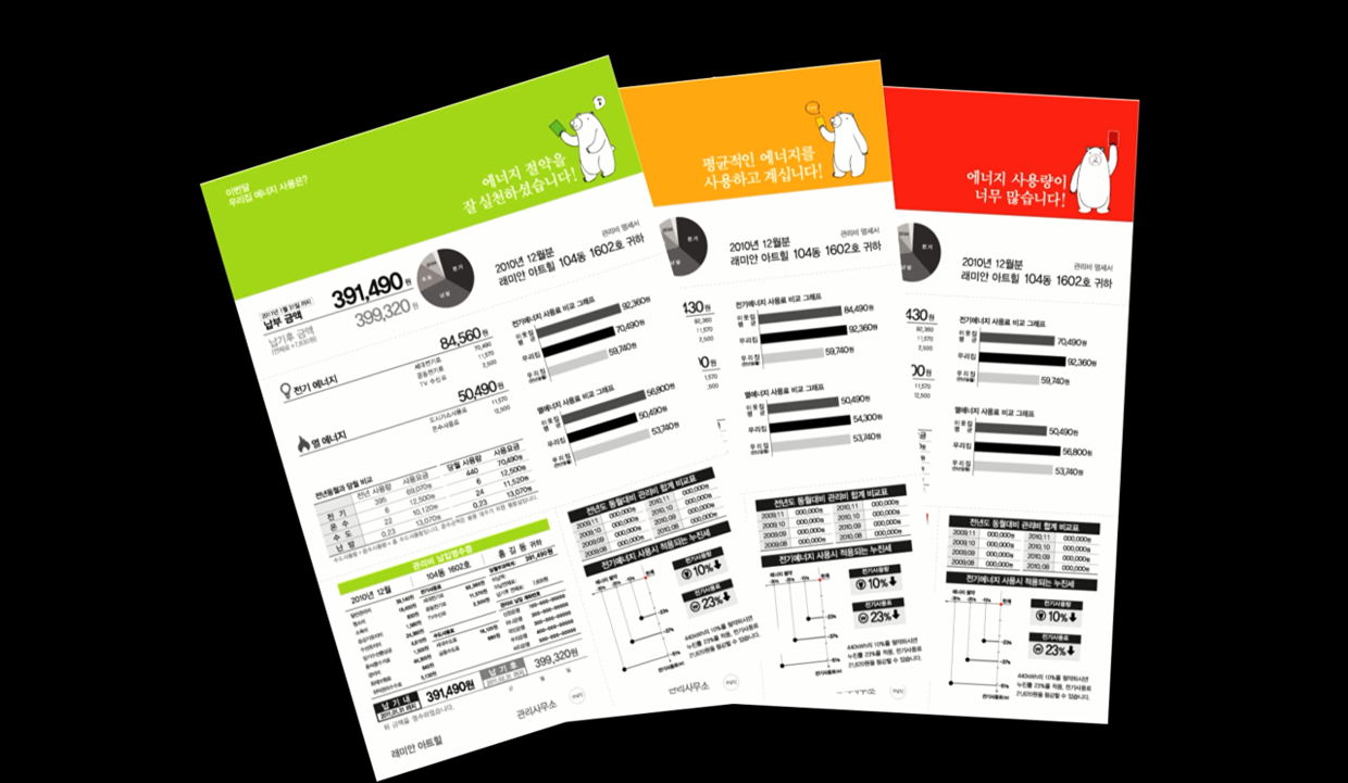 같은 평형대 이웃보다 에너지를 많이 사용하면 빨간색 고지서를, 보통은 노란색을, 적게 사용한 집은 녹색 고지서를 받게 된다. 정보디자인을 활용하여 사용량도 쉽게 알아볼 수 있게 개발했다. 고지서에 담긴 정보는 오래 정확히 기억될 수 있는 정보디자인으로 표현되어 사용자의 행동을 변화시키는 역할을 한다. 보기에만 좋은 고지서가 아니라 사용자 리서치와 테스트를 통해 에너지 절감해야겠다는 필요를 느끼고 행동으로 이어질 수 있게 하는 디자인이다.