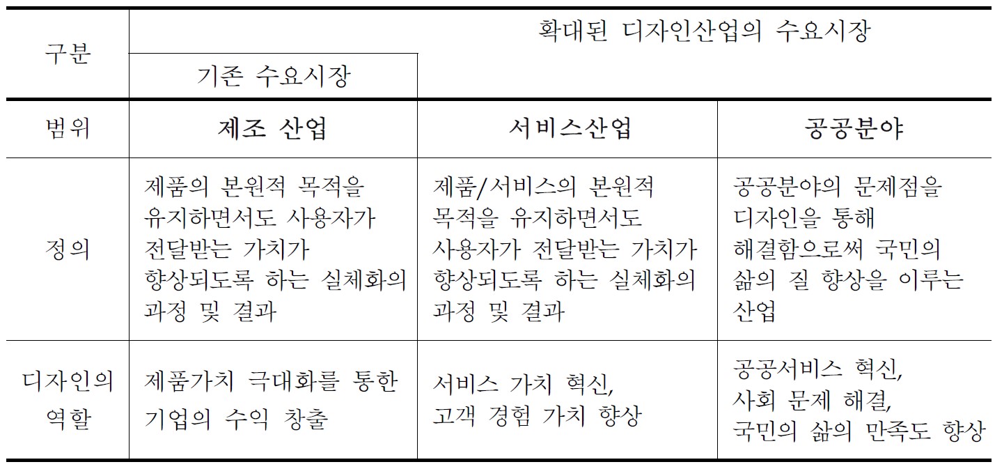 <표 : 확장되고 있는 디자인의 개념, 수요시장에 따른 역할 윤성원 등 (2011)>
