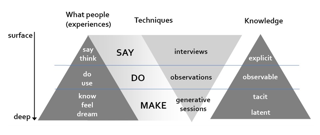 말이나 글로 하는 리서치보다는 관찰 리서치가, 그보다는 함께 하는 워크숍 등의 참여적 리서치가 더 깊이 있는 잠재 욕구를 발견할 가능성이 더 큼을 의미한다.