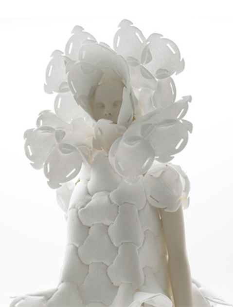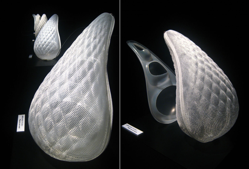 사진은 모듈형의 섬유 타일로 조합해 새로운 디자인을 만들 수 있는 옷과 특이하게 직조되어 물건을 넣으면 물방울처럼 형태가 부푸는 가방이다. 디자이너가 앞으로 산업의 새로운 용처를 제시하는 역할을 할 수 있음을 보여주는 사례이다.