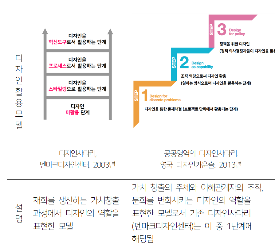 덴마크 디자인센터의 디자인 사다리는 '가치생산과정에서 디자인의 역할'에 관한 모델이다. 디자인 사다리의 4단계는 모두 영국 디자인카운슬의 3 계단 중 첫 번째 단계(Step 1)에 해당한다. 무언가를 만들어내는 과정에서 디자인이 생산의 도구로서 역할을 넓혀가는 정황을 표현한 것이기 때문이다. 최근 몇 년 간의 수요시장의 요구 변화, 디자인에이전시의 역할 변화 등을 보면 분명 새로운 층인 2단계(Step 2) 이상으로 발전되고 있는 정황이 나타나고 있다.