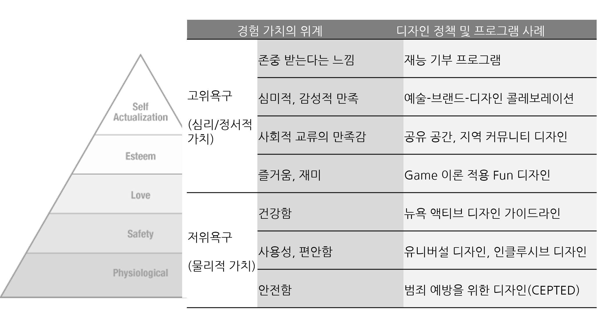 이것은 인간의 욕구 단계에서 착안점을 얻을 수 있을 것이다. 매슬로는 욕구 단계설 매슬로의 욕구단계설(Maslow’s hierarchy of needs : 인간의 욕구가 일련의 단계를 형성한다는 동기 이론. 생리적 욕구, 안전의 욕구, 애정과 소속의 욕구, 존중의 욕구, 자아실현의 욕구. 하위의 욕구가 충족되면 다음 단계의 욕구가 나타남)을 통해 인간의 욕구가 일련의 단계를 형성하고 있으며 하나의 하위 욕구가 충족되면 위계 상 상위층의 다른 욕구가 생겨나는 인간 심리의 특징을 설명하고 있다. 인간의 욕구가 상위층으로 점진적으로 상승하게 된다고 본다면 디자인의 활용 과제 역시 단계적으로 고도화되는 로드맵을 갖는 것이 바람직할 것이다. 가장 하위에 위치한 욕구는 생리적 욕구와 안전의 욕구이다. 이는 물리적 가치 추구의 욕구이면서 기본적인 생리적 욕구(의, 식, 주, 수면, 성에 관한 욕구)와 안전의 욕구(신체적, 심리적 안전 및 위험회피에 관한 욕구)에 관한 문제를 말하는데 이에 대한 디자인 과제들이 가장 먼저 다루어지는 것이 합리적이다. 따라서 그 기준으로 볼 때 최우선으로 고려되어야 할 디자인 적용 분야는 범죄 예방, 안전한 근로와 생활환경에 관한 것이라고 할 수 있다.