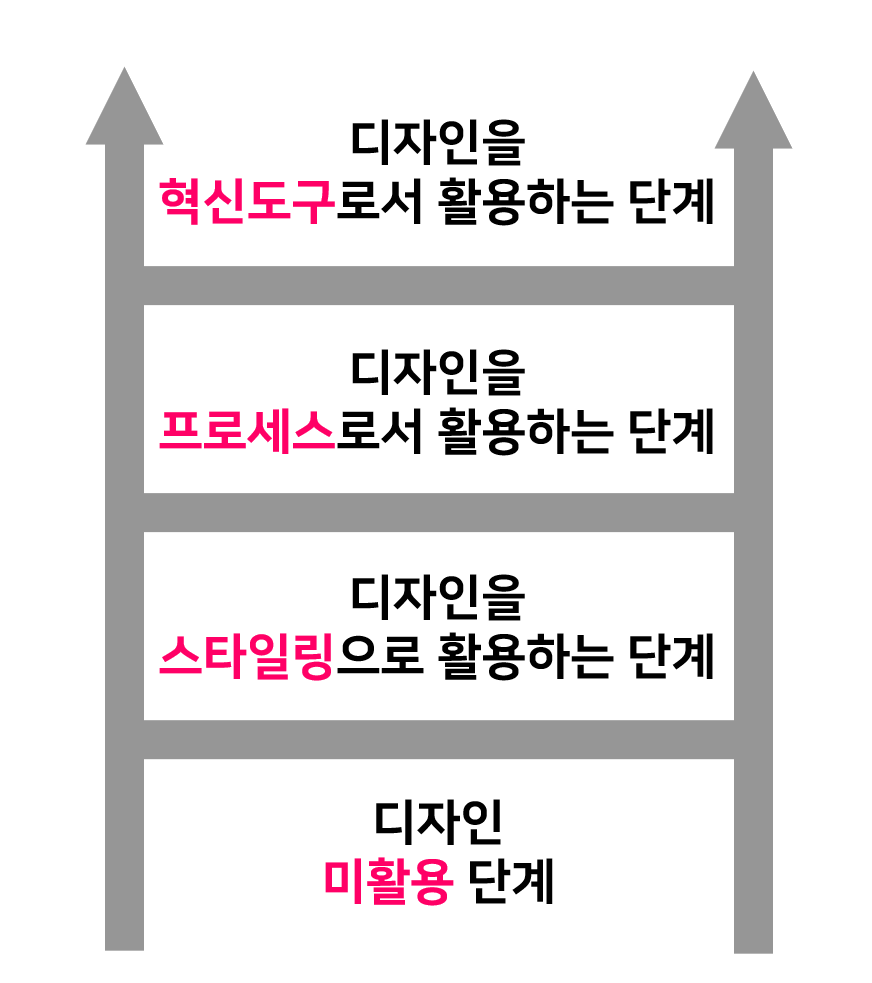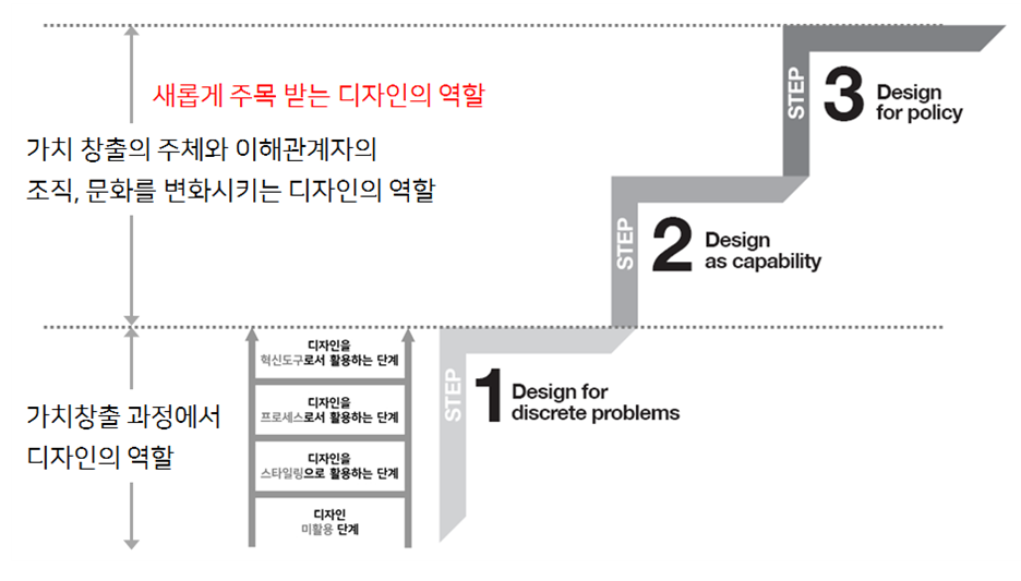 에서 디자인이 활용되고 있는 정황을 3단계의 계단으로 표현했다.