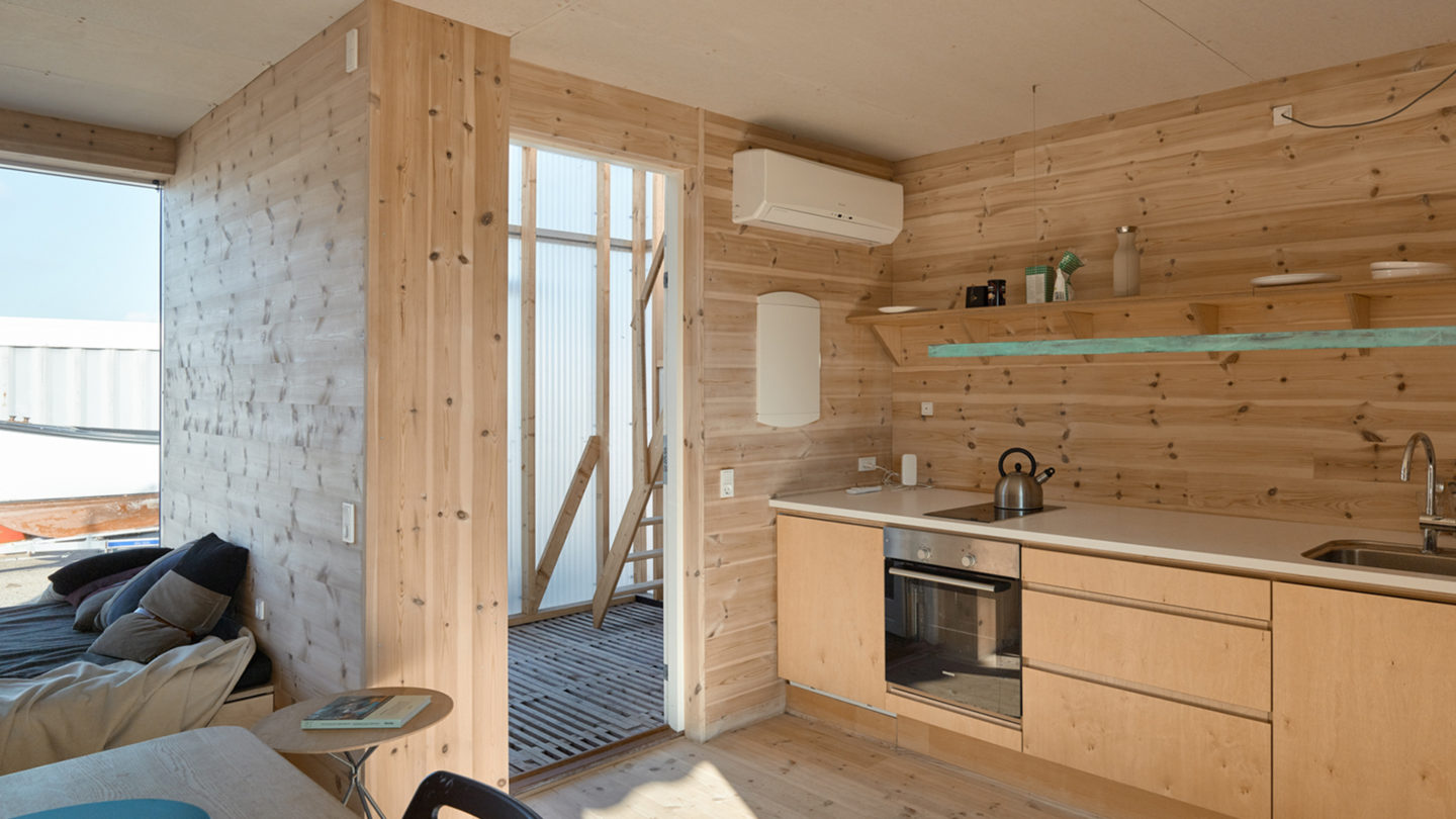 컨테이너 주택 내부는 라운지/식사 공간, 주방, 베드가 있는 침실, 샤워 시설과 화장실이 있는 욕실이 있다. 인테리어 마감재는 페인트, 석고 등의 마감재와 비교한 결과 목재로 결정되었다. 벽과 바닥은 스웨덴산 소나무로 마감되어 있고 천장에는 난연성 섬유판이 설치되었다. 컨테이너에 큰 창도 만들었다.