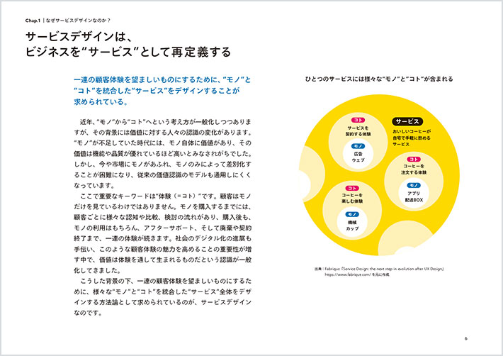 ![]() 보급 개발 콘텐츠 이미지(P.6): 제목 '서비스디자인은 비즈니스를 '서비스'로 재정의한다'. 소제목 '일련의 고객 경험을 바람직한 것으로 만들기 위해 '사물'과 '행위'를 결합한 '서비스'를 디자인하는 것이 요구되고 있다'에 이어 본문이 게재되어 있다. 요구되고 있다"라는 소제목에 이어 본문이 게재되어 있다. 또한, 하나의 서비스에 다양한 사물과 서비스가 포함되는 모습을 표현한 그래픽도 함께 실려 있다. |
