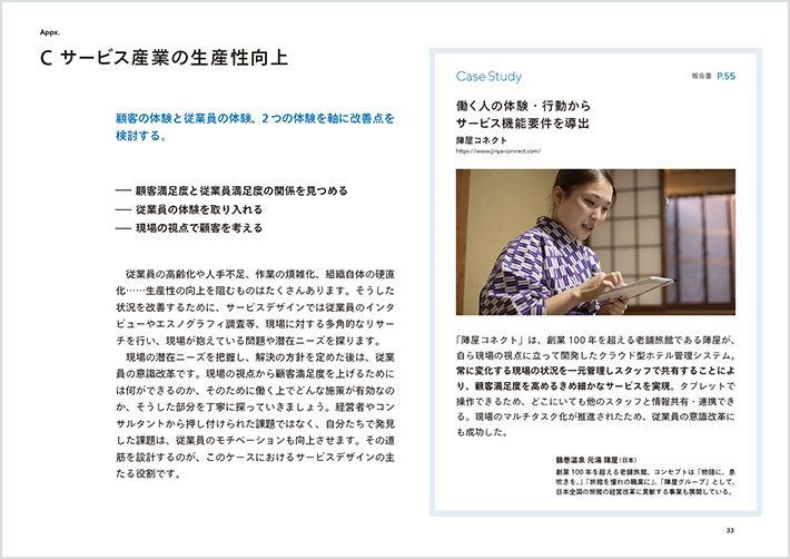 ![]() 보급 개발 콘텐츠 이미지(P.33): 제목 '서비스 산업의 생산성 향상'. 소제목 '고객의 경험과 종업원의 경험, 그리고 경험을 중심으로 개선점을 검토한다'. 에 이어 본문이 들어간다. 또한 Case Study로 '진야 커넥트'의 사례가 이미지와 함께 게재되어 있다. |