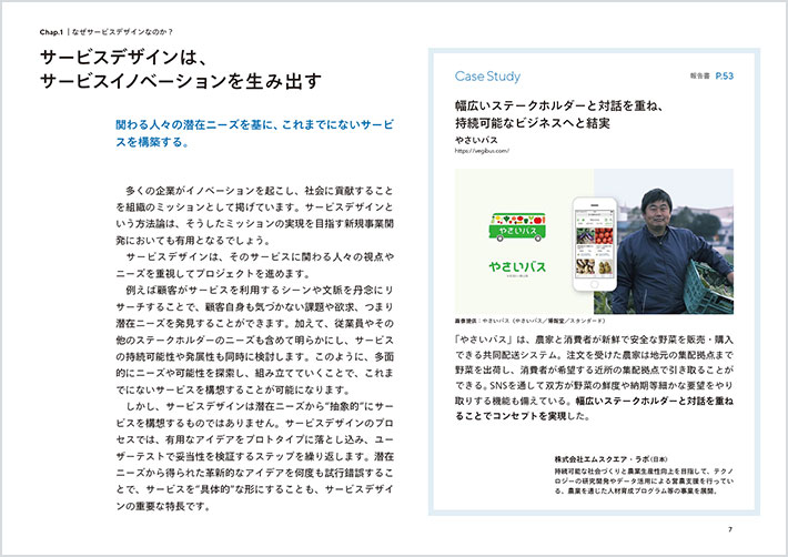 ![]() 보급 개발 콘텐츠 이미지(P.7): 제목 '서비스 이디자인은 서비스 혁신을 만든다'. 소제목 '관계자의 잠재적 니즈를 바탕으로 지금까지 없었던 서비스를 구축한다'에 이어 본론이 들어간다. 또한 Case Study로 '야사이버스' 사례가 이미지와 함께 게재되어 있다. |